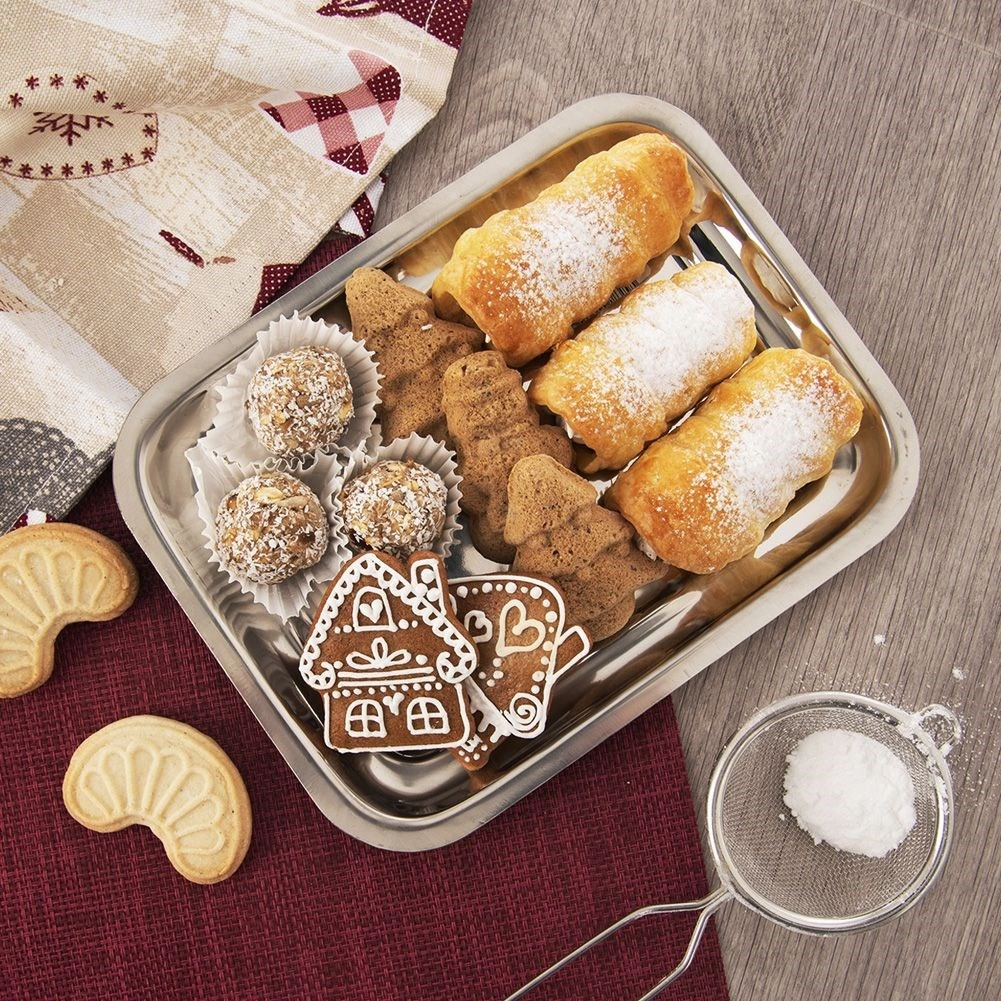 Elegantný nerezový tác v obdĺžnikovom tvare s rozmermi 21,5 × 16,5 × 1,5 cm je ideálny na každodenné aj slávnostné servírovanie. Vďaka kvalitnej nerezovej oceli s vysokým leskom, pevnej konštrukcii a mierne zvýšeným okrajom sa pohodlne prenáša, skvele vyzerá a ľahko čistí. Perfektný do domácnosti aj gastronómie.