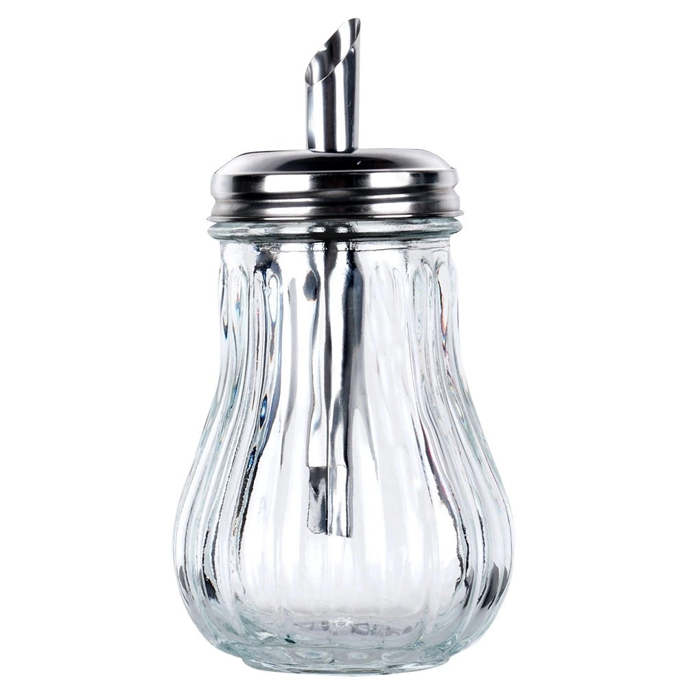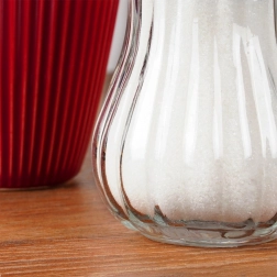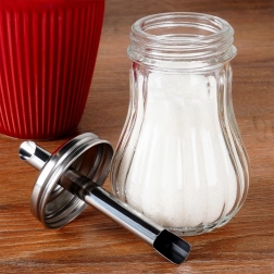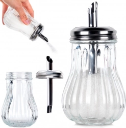Táto sklenená cukornička s praktickým dávkovačom umožňuje rýchle a čisté dosladzovanie kávy, čaju aj dezertov. Jedno preklopenie zodpovedá zhruba jednej čajovej lyžičke, takže vždy nasypete rovnaké množstvo. Číre sklo poskytuje okamžitý prehľad o stave zásob, nerezový uzáver so šikmou hubicou zaistí presné a kontrolované sypanie bez rozsýpania.