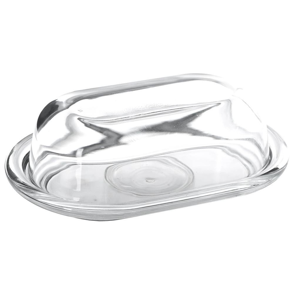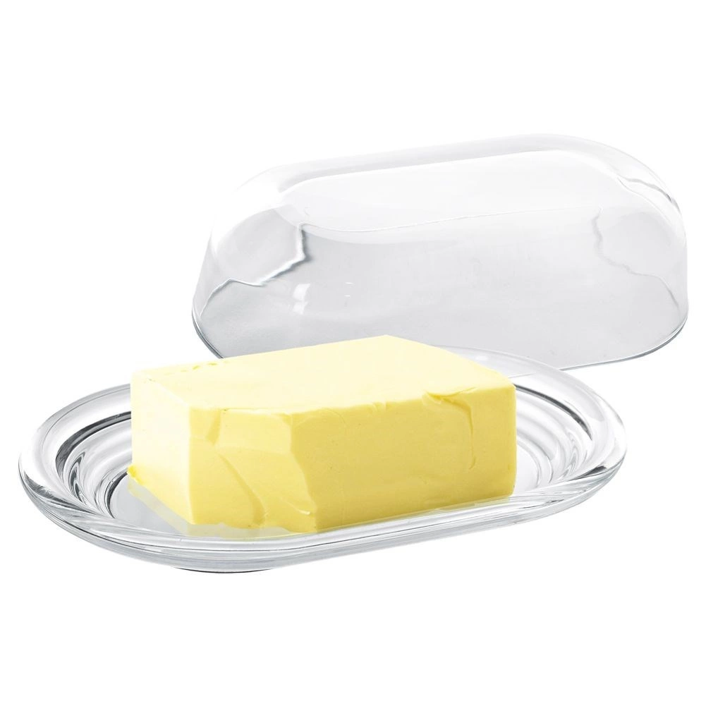 Číre sklo a tvarovaná základňa umožnia elegantné servírovanie aj rýchlu vizuálnu kontrolu množstva masla v chladničke či na stole.