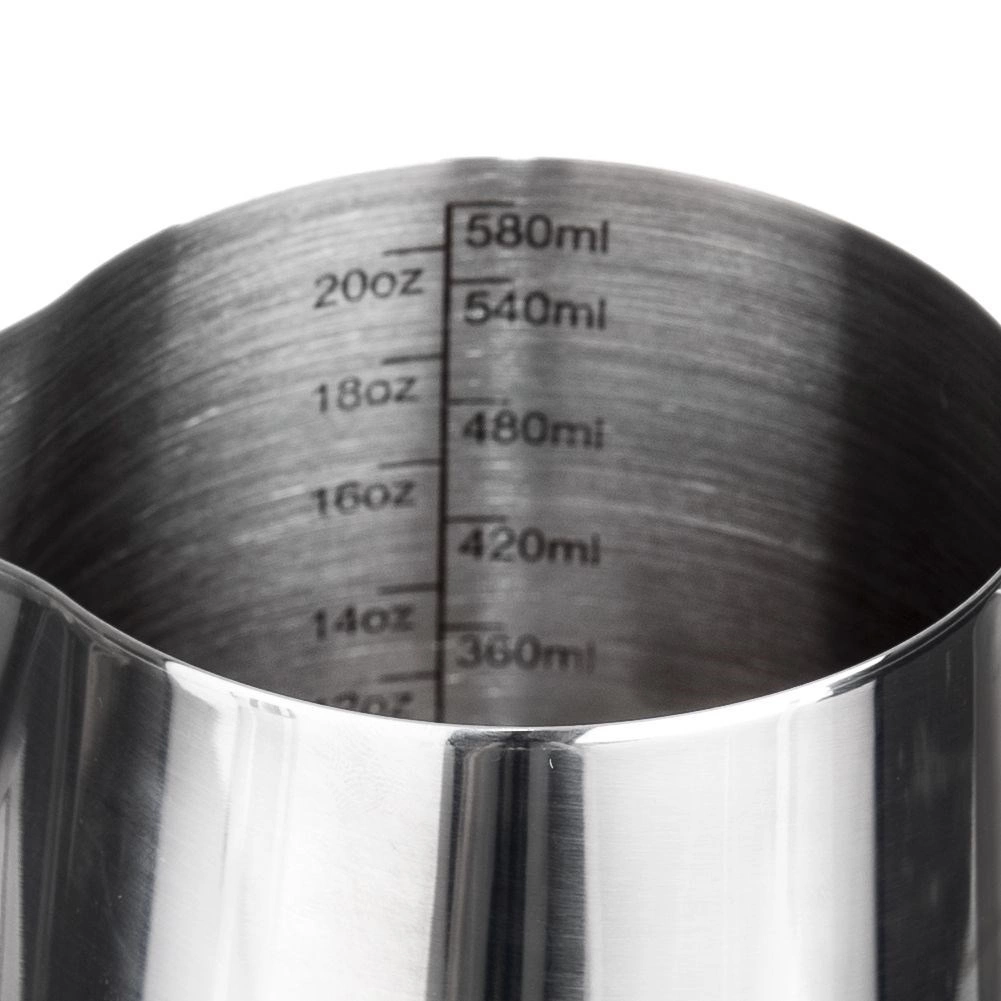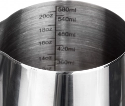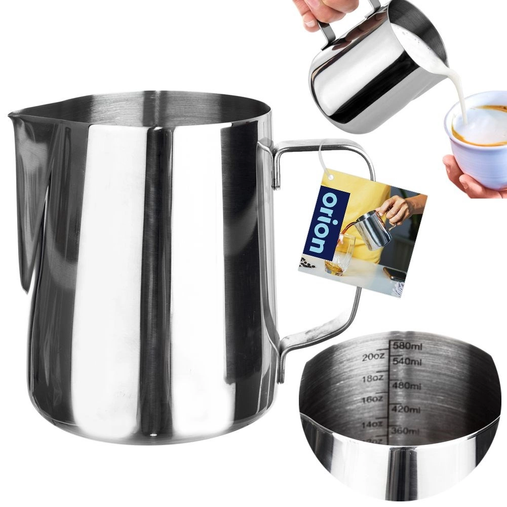 Praktická nerezová kanvička na mlieko s objemom 580 ml s vnútornou mierkou na presné dávkovanie je ideálna na prípravu kávy a latte art. Ponúka odolné vyhotovenie z nehrdzavejúcej ocele, pohodlné nalievanie vďaka presnému zobáčiku a bezpečný úchop. Vhodná na ohrev na plynovej, elektrickej aj sklokeramickej varnej doske (nevhodná na indukciu).