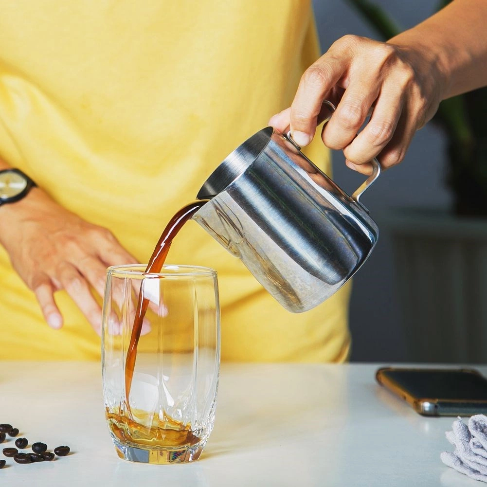 Štýlový a funkčný pomocník pre baristov aj milovníkov kávy. Kanvička je vyrobená z kvalitnej nehrdzavejúcej ocele, ktorá sa ľahko čistí, je odolná proti korózii a výborne vedie teplo. Vnútorné rysky po 60 ml umožňujú presné odmeranie mlieka či smotany pre dokonalé cappuccino alebo latte.