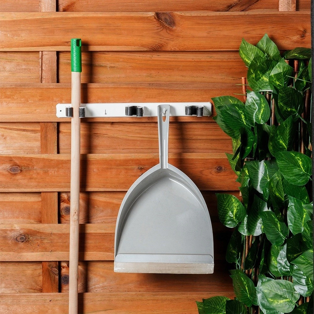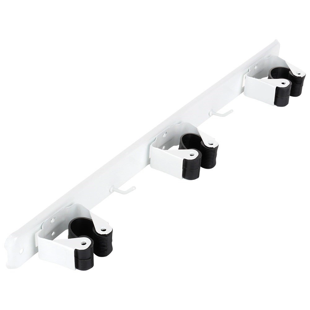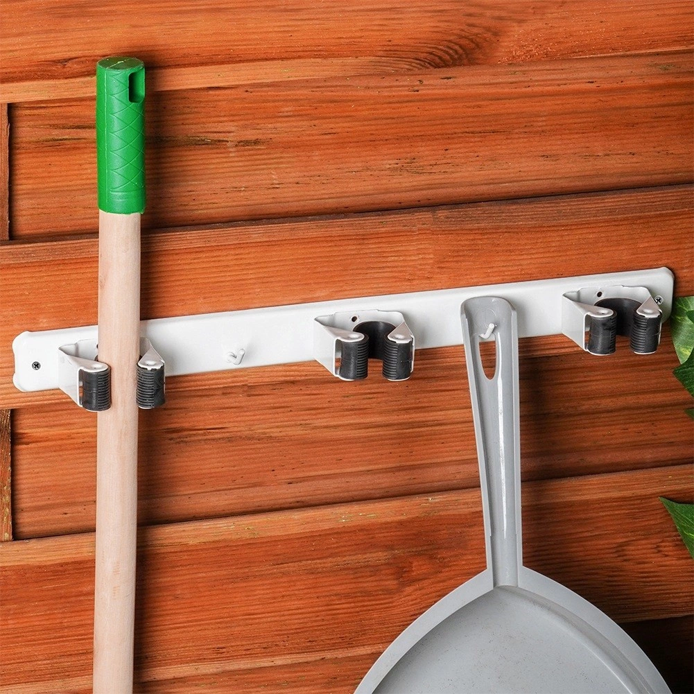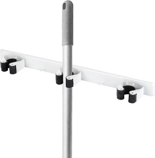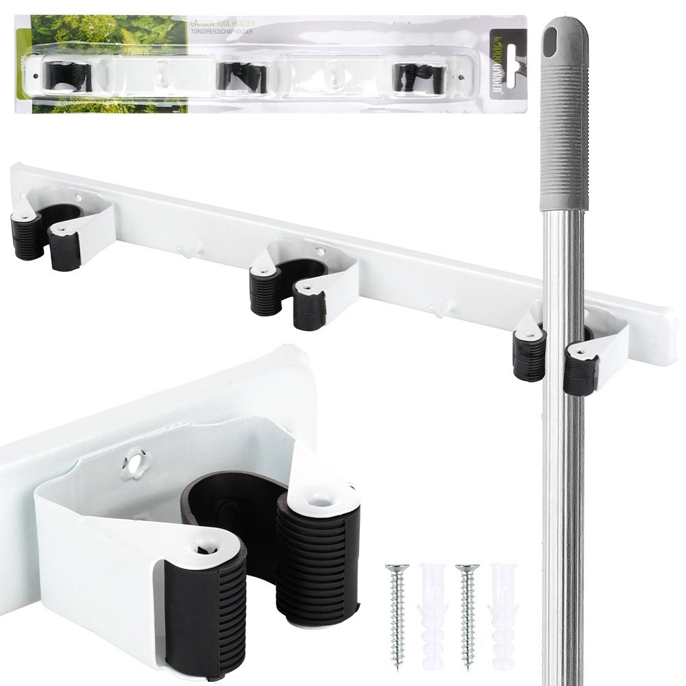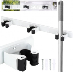 Praktický nástenný držiak na mop, metlu a záhradné či upratovacie náradie s tromi pružinovými úchytmi a dvoma háčikmi. Ponúka úsporu miesta, bezpečné uchytenie násad a ľahký prístup k nástrojom. Robustná kovová konštrukcia v bielej farbe so silnými gumovými valčekmi pre isté zovretie. Ideálny do kúpeľne, kuchyne, technickej miestnosti alebo garáže.