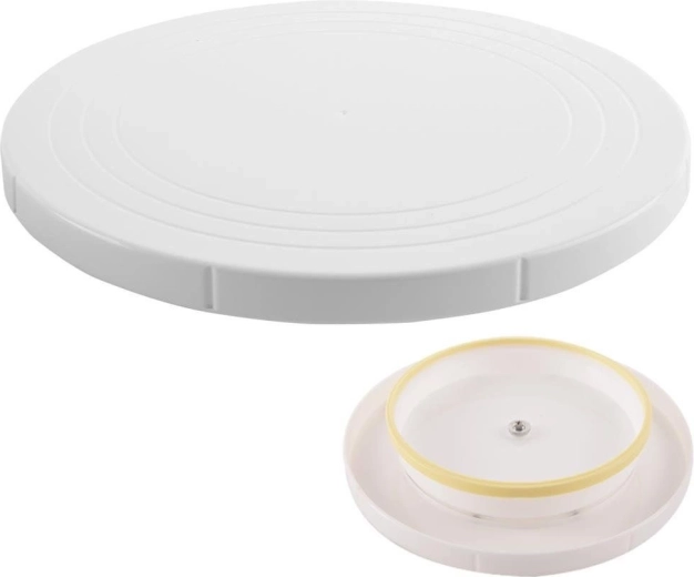 Praktická otočná etažérka na tortu s priemerom 27 cm uľahčí zdobenie aj servírovanie. Vďaka stabilnej základni s protišmykovou gumou sa pri práci nepohne a plynulo sa otáča oboma smermi. Je z kvalitného plastu, ľahko sa čistí a je vhodná na torty, koláče, cupcakes aj slané jednohubky. Ideálna na zdobenie, plynulé otáčanie a stabilnú prácu na kuchynskej linke.