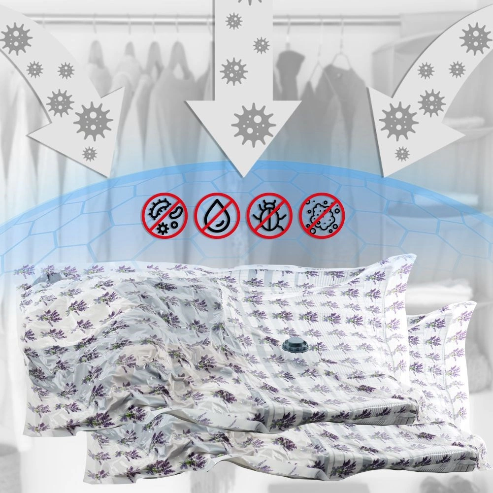 Ušetrite až 75 % miesta s praktickým vákuovým vreckom s rozmerom 40 × 60 cm. Chráni textil pred prachom, vlhkosťou, roztočmi aj moľami, má hermetický dvojitý zips a spätný ventil na jednoduché vysatie vzduchu. Odolná fólia s levanduľovým vzorom a jemnou vôňou je ideálna do šatníka, na cestovanie aj pri sťahovaní.