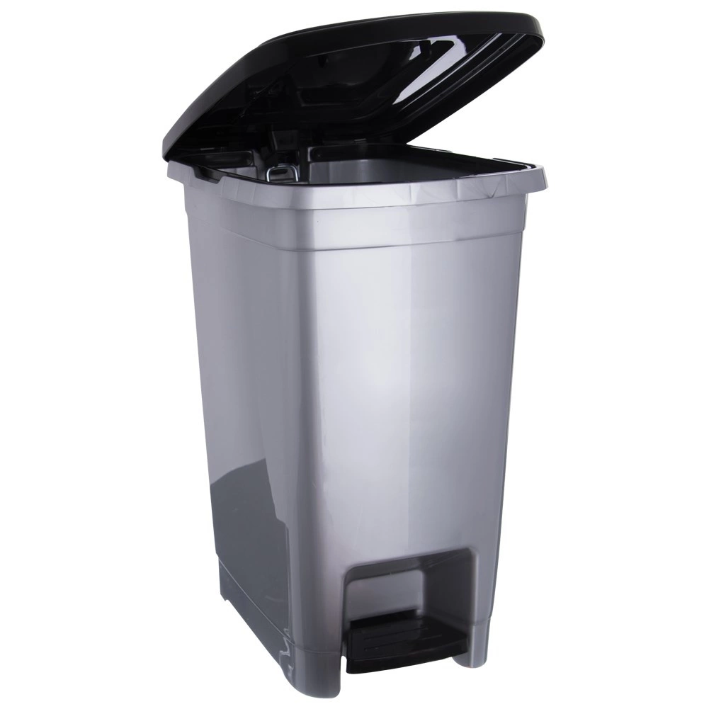 Kôš je vyrobený z odolného plastu v elegantnej sivej farbe, veko a pedál sú čierne. Vo vnútri sa nachádza výklopný rám, ktorý pevne drží vrecko na odpad, takže sa nesúva a výmena je jednoduchá. Tesniace veko účinne bráni šíreniu pachov. Úzke telo koša šetrí miesto a viac košov vedľa seba možno využiť na triedenie odpadu.