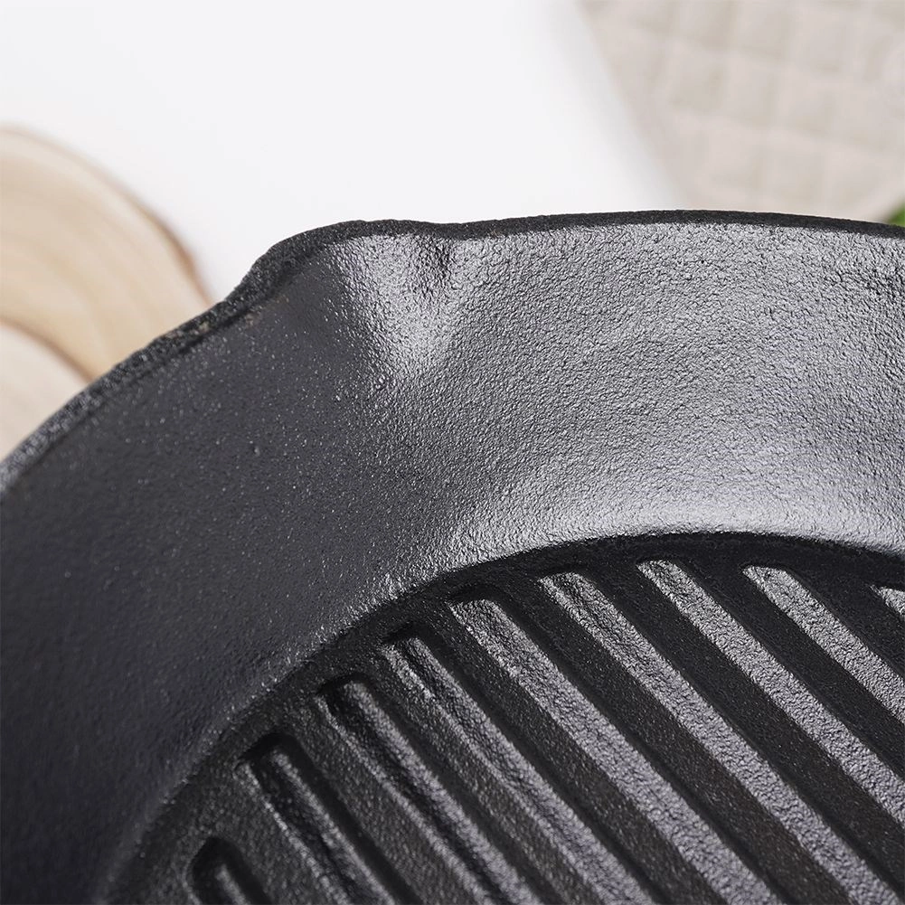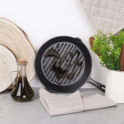 Táto liatinová grilovacia panvica 24 cm je ideálna na intenzívne restovanie, pečenie a grilovanie. Ťažká liatina sa rovnomerne zohrieva a dlho drží teplotu, takže pokrmy zostávajú dlhšie teplé a šťavnaté. Vnútorný rebrovaný povrch odvádza prebytočný tuk a vytvára atraktívnu grilovaciu potlač.