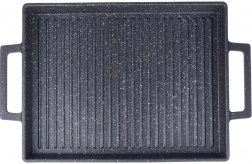 Univerzálna grilovacia doska z hliníka s kvalitnou granitovou nepriľnavou vrstvou PFLUON GRANIT zabezpečuje rýchle a rovnomerné rozloženie tepla. Vysoké okraje a široké bočné úchyty uľahčujú manipuláciu, ryhovaný povrch zas vytvára atraktívne mriežkované opečenie a odvádza prebytočný tuk pre zdravšiu prípravu jedál.