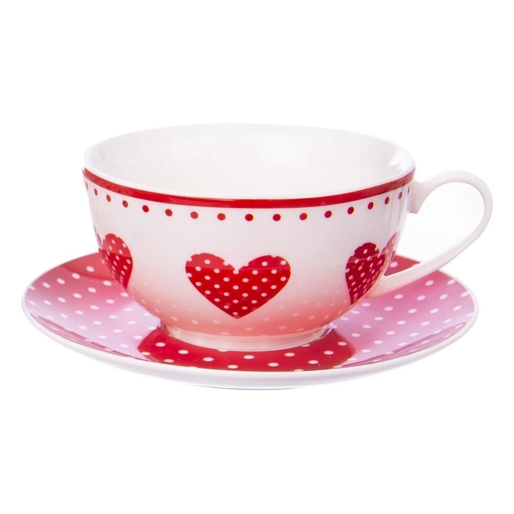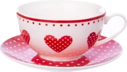Štýlová čajová súprava typu „tea-for-one“ z kvalitného porcelánu kombinuje čajovú kanvičku 380 ml, šálku 340 ml a podšálku 15 cm. Biely základ zdobia romantické červené srdcia a bodky, kanvička má praktické viečko a oba diely pohodlné uško. Vhodné do umývačky riadu aj mikrovlnnej rúry – ideálne na každodenný rituál aj ako nápaditý darček!