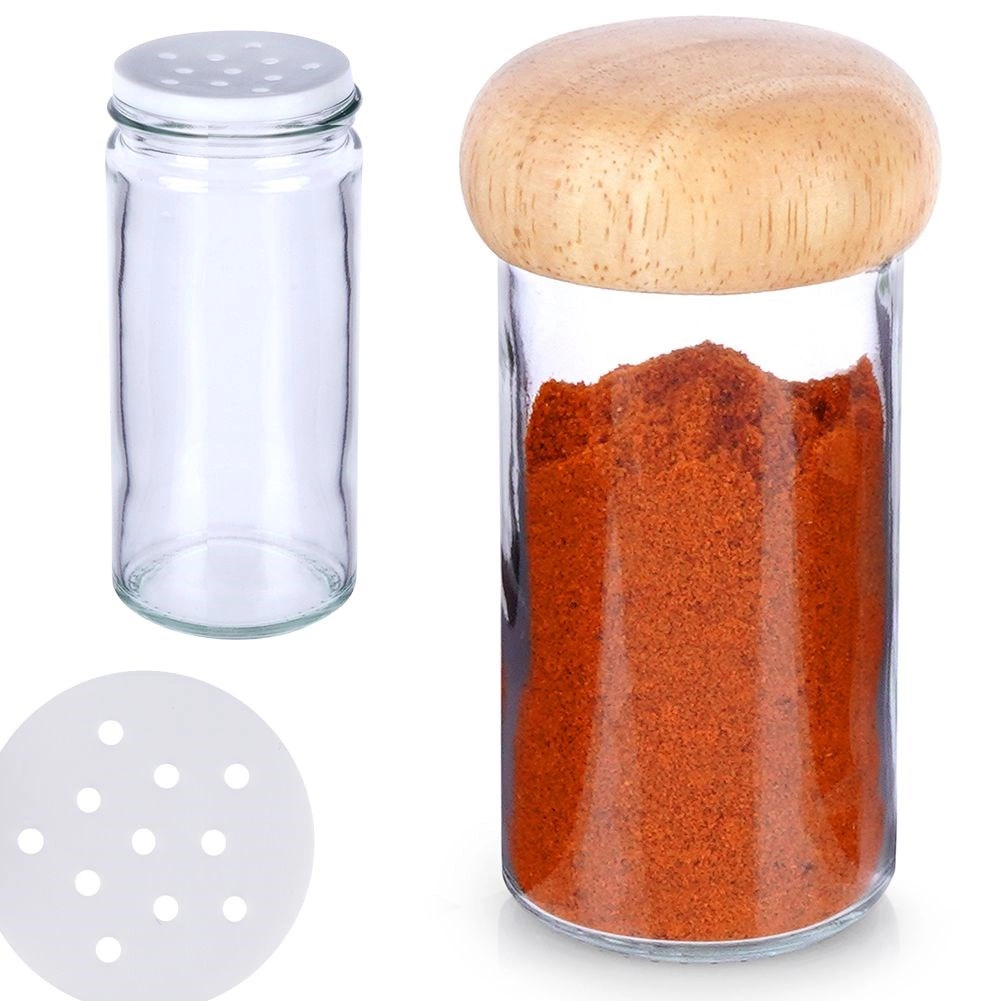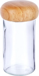 Číre sklo pre perfektný prehľad o obsahu a drevené skrutkovacie viečko, ktoré pomáha chrániť koreniny pred vlhkosťou a predlžuje ich čerstvosť.