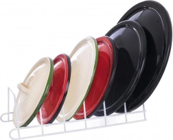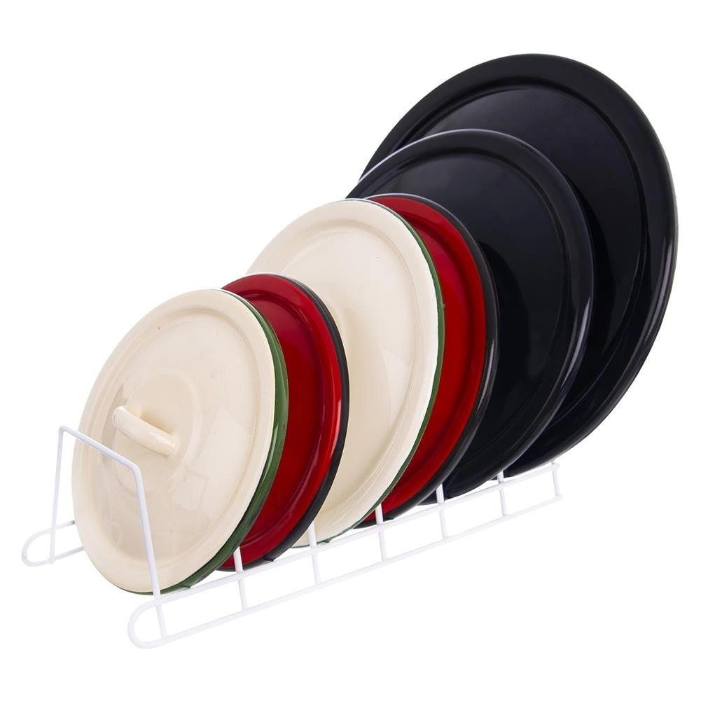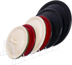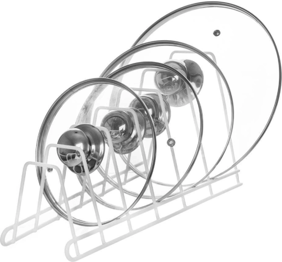 Stojan je vhodný pre rôzne veľkosti a typy – od pokrievok s úchytom po plytké taniere a krájacie dosky, do skrinky aj na linku.