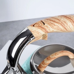 Ergonomická rukoväť s imitáciou dreva sa nezohrieva a vďaka tlačidlu v madle automaticky otvára píšťalkové hrdlo pre pohodlné a bezpečné nalievanie.
