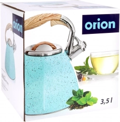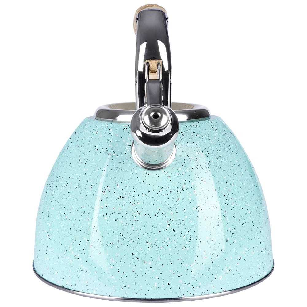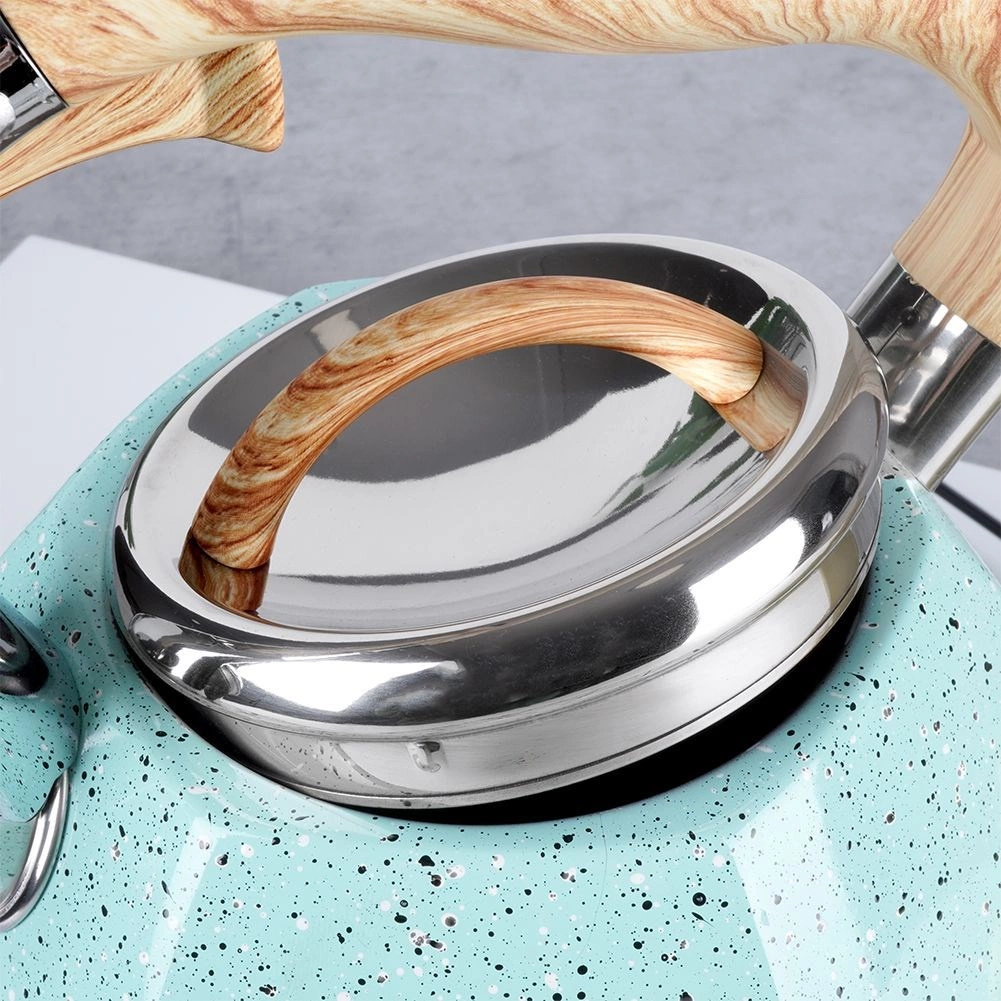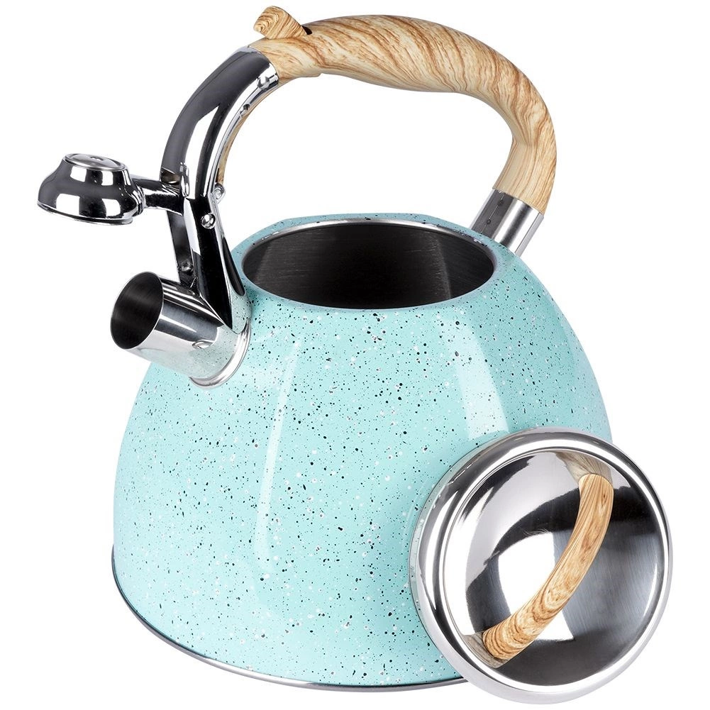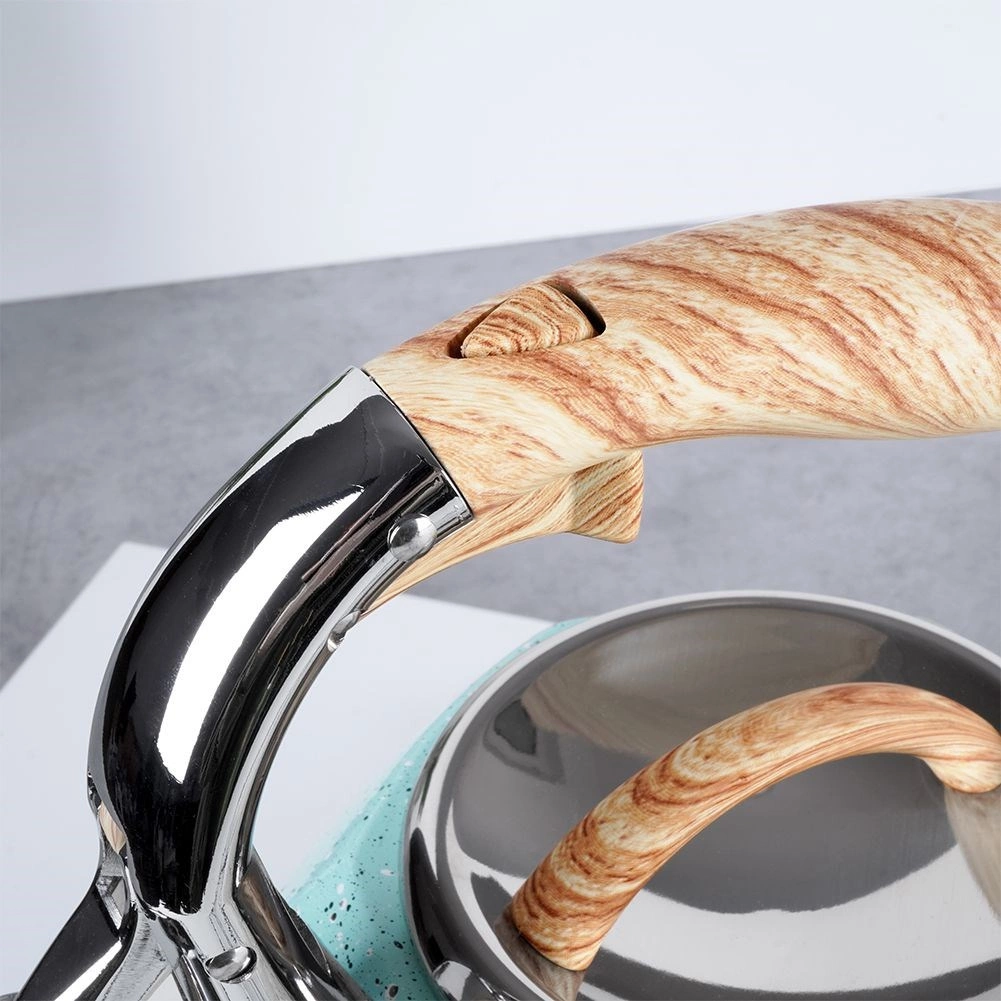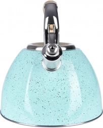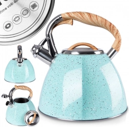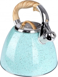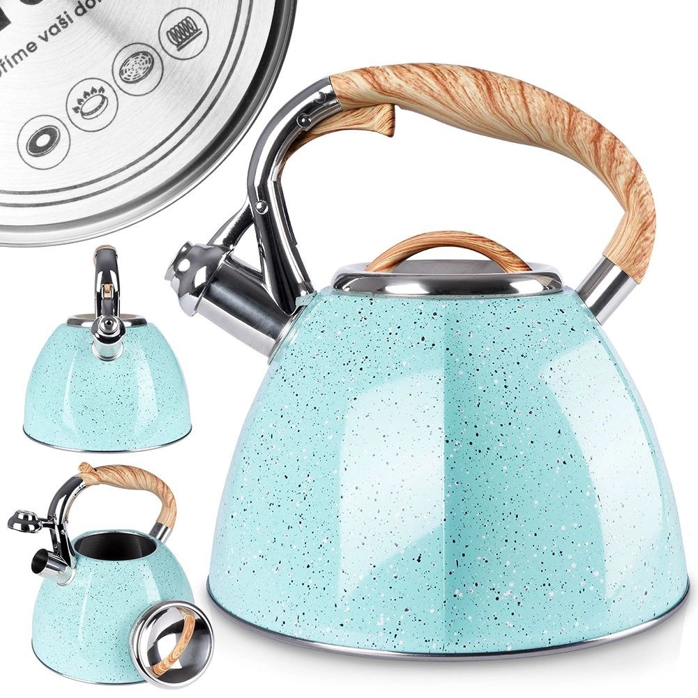 Štýlová čajová kanvica z nehrdzavejúcej ocele so smaltovaným modrým povrchom, píšťalkou a nezohrievajúcim sa madlom v dekore dreva. Vhodná na všetky typy sporákov vrátane indukcie, úžitkový objem 3 l (celkový 3,5 l). Pohodlné nalievanie vďaka tlačidlu pre automatické otvorenie hrdla a širokému veku na jednoduché plnenie a čistenie.