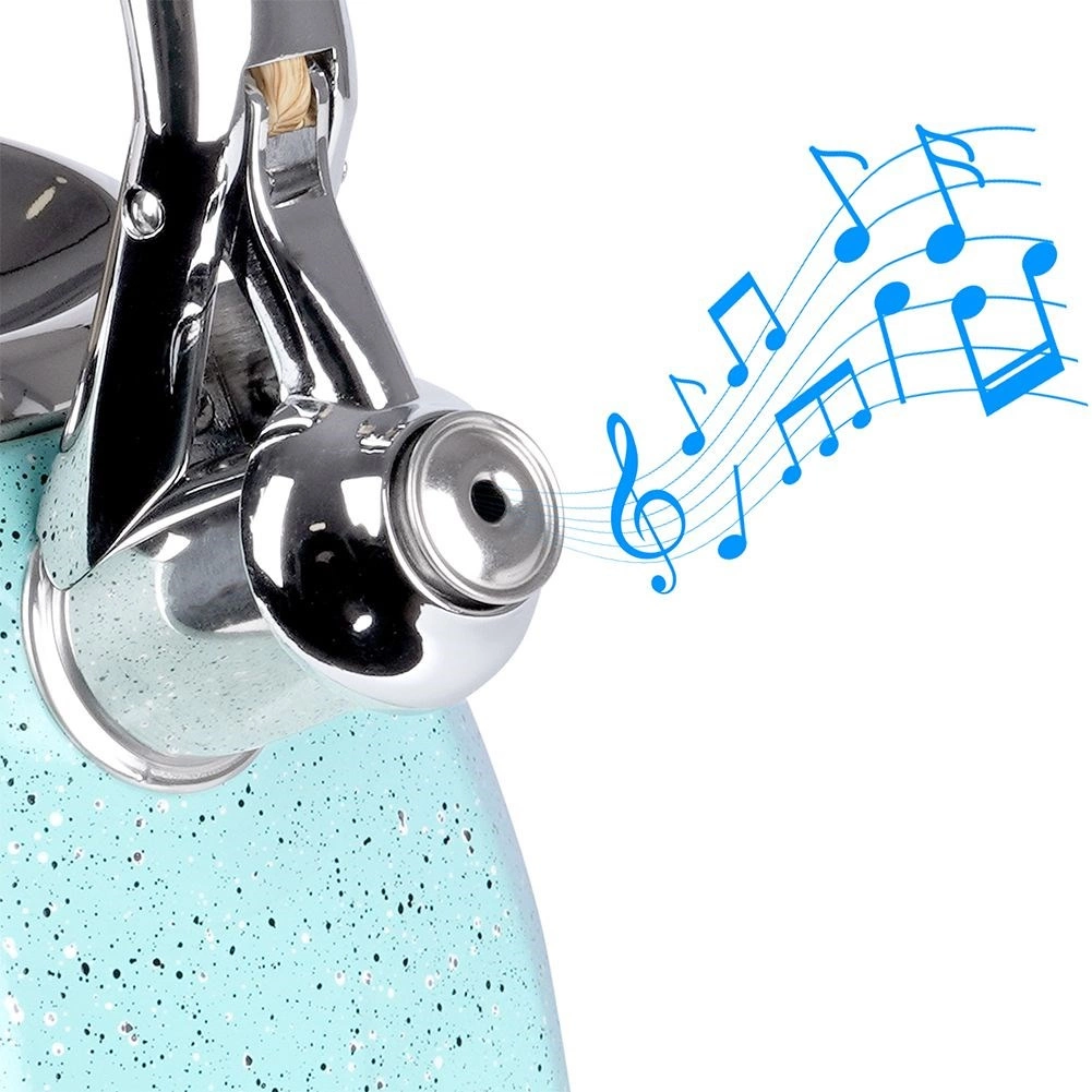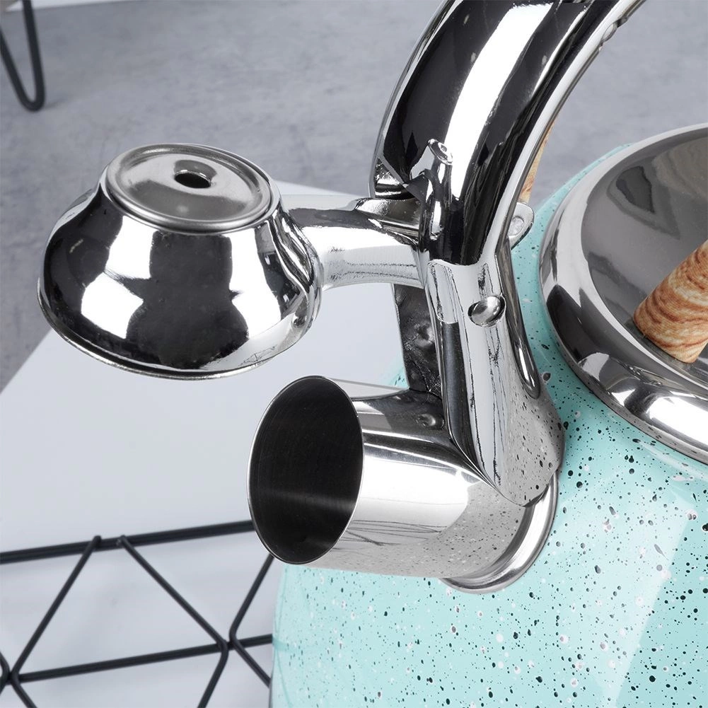 Táto elegantná čajová kanvica spája moderný dizajn s praktickosťou na každodenné používanie. Odolné telo z nehrdzavejúcej ocele so smaltovaným povrchom v obľúbenej modrej farbe zabezpečuje rýchle a rovnomerné zohrievanie vody, zatiaľ čo píšťalka spoľahlivo upozorní na var. Ergonomická rukoväť s efektom dreva sa nezohrieva a pohodlne sa drží.