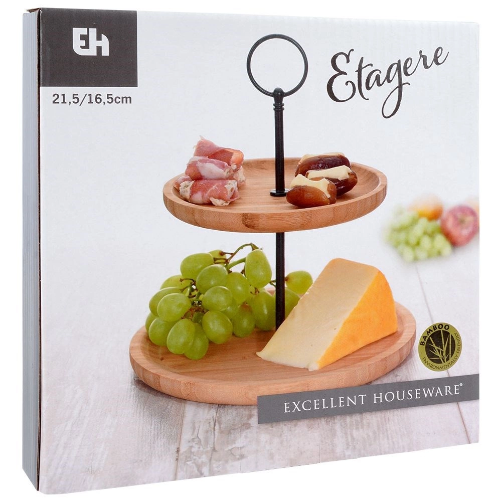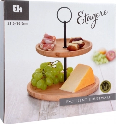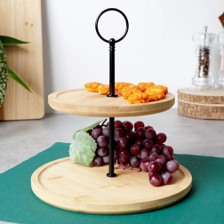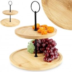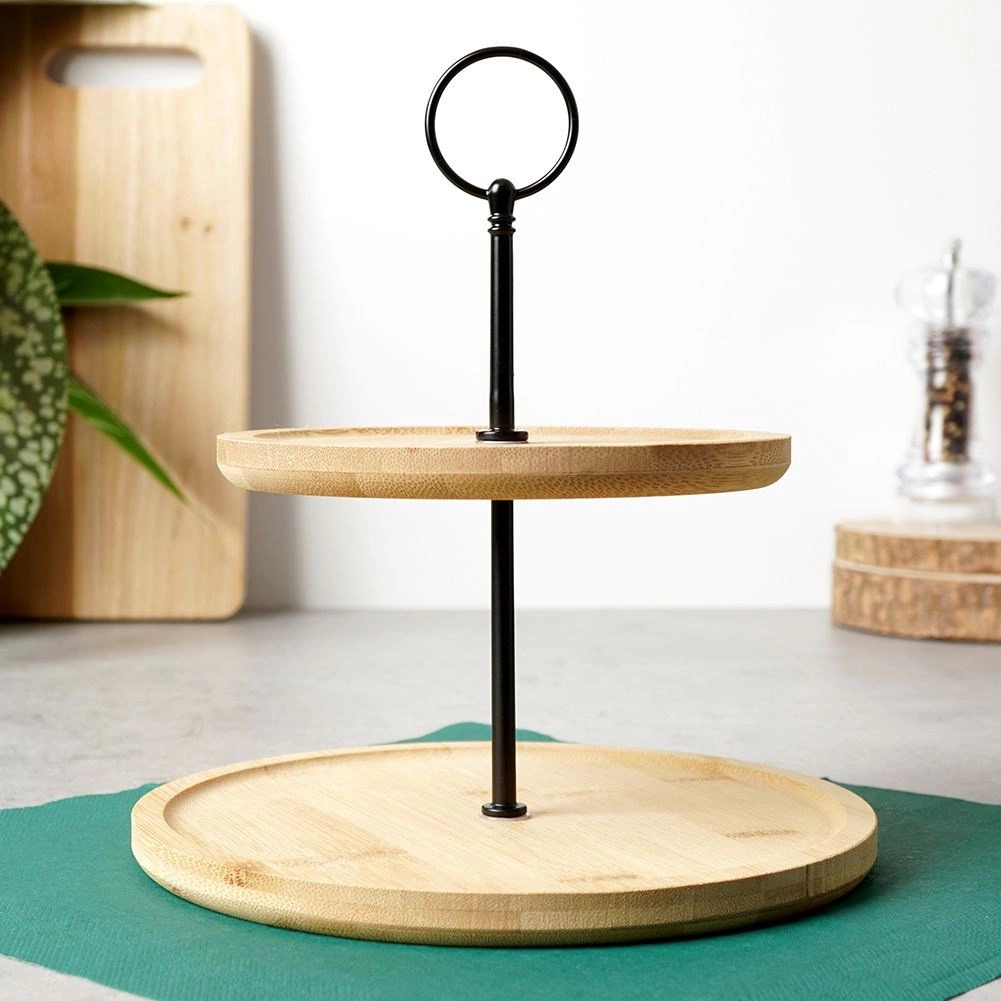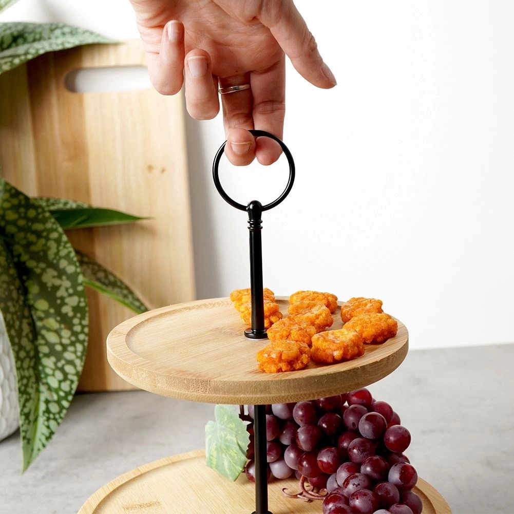 Doprajte svojmu stolu elegantný doplnok: dvojposchodovú etažérku z prírodného bambusu s robustnou kovovou konštrukciou v čiernej farbe. Je ideálna na cupcaky, sušienky, mini dezerty, ovocie aj slané jednohubky. Dve úrovne šetria miesto a zároveň umožnia pútavú prezentáciu.