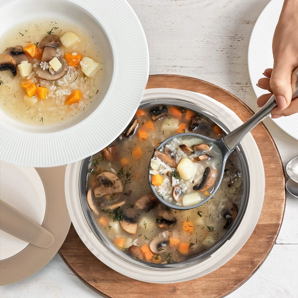 Vďaka izolačnej konštrukcii s nehrdzavejúcim vnútrom zostávajú polievky a hlavné jedlá teplé, dezerty a zmrzlina príjemne studené.