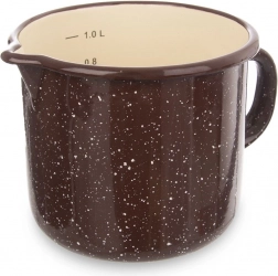 Štýlový hnedý smalťovaný hrnček s béžovým škvrnitým vzorom v retro dizajne uľahčí každodenné varenie aj pečenie. Vďaka praktickej výlevke sa pohodlne leje a vnútorná mierka umožní presné odmeranie tekutín aj sypkých surovín bez ďalších pomôcok. Pevné ucho zaistí bezpečnú a pohodlnú manipuláciu.