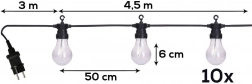 - 10 LED žiaroviek s priemerom cca 6 cm, rozstupy medzi žiarovkami cca 50 cm.