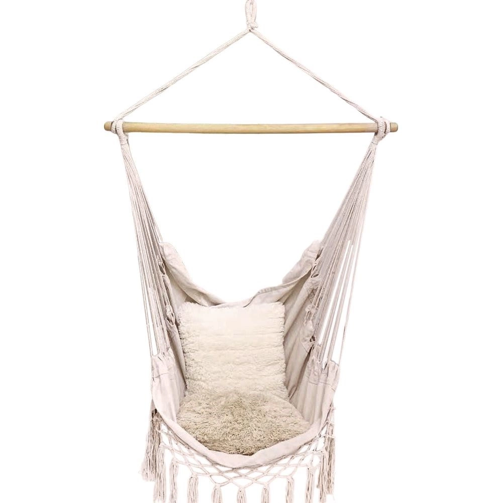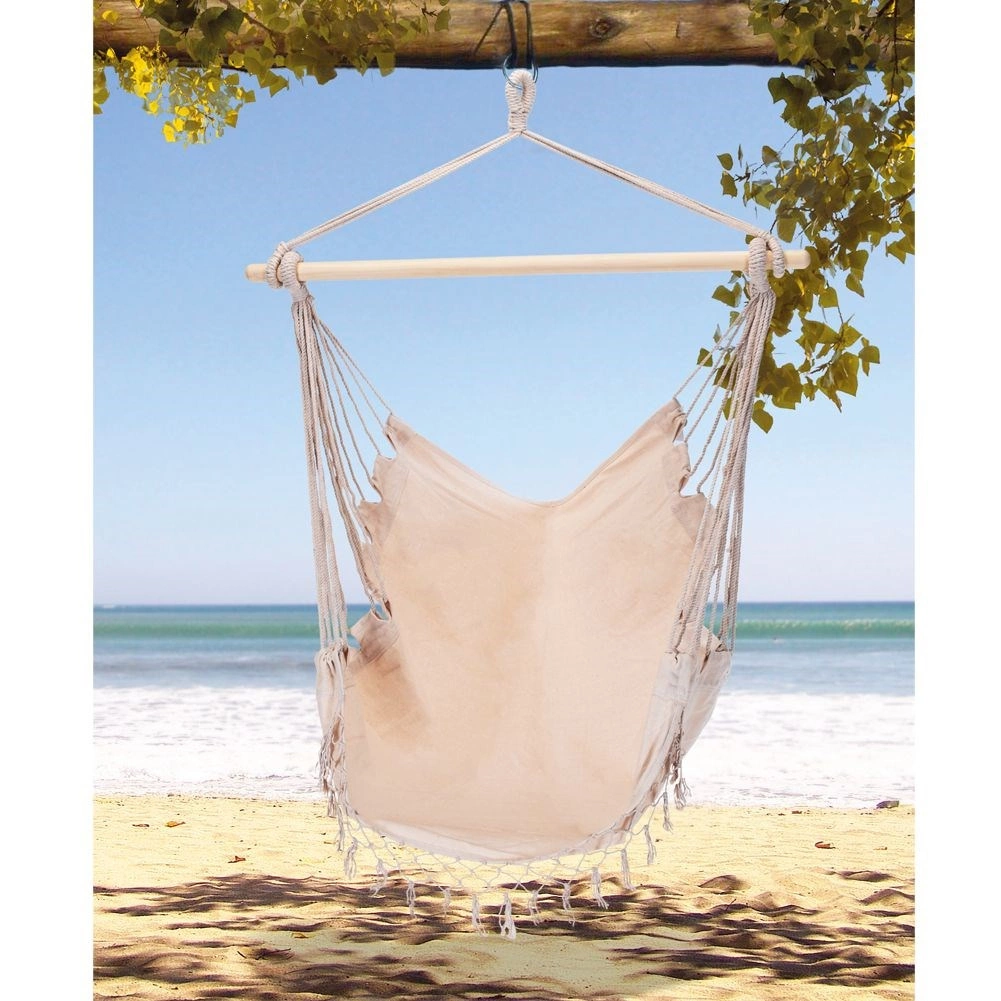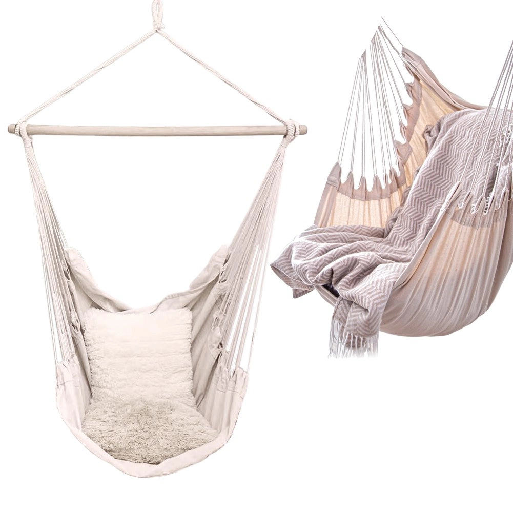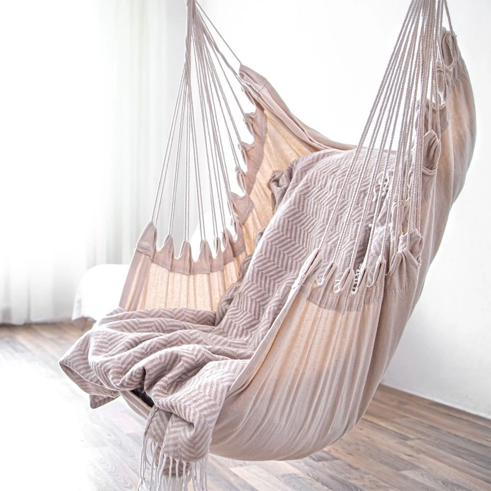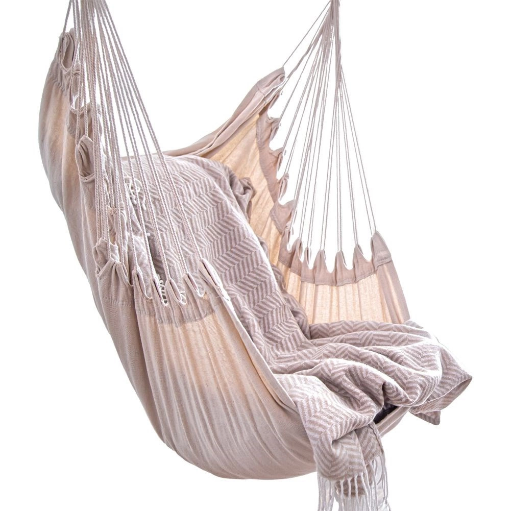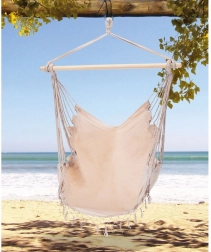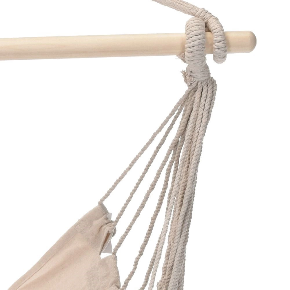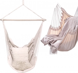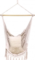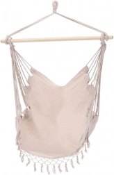 Elegantné závesné kreslo hamaka v béžovej farbe je skvelou voľbou na záhradu, balkón, terasu aj do interiéru. Vďaka jednému závesnému bodu šetrí miesto a vytvorí vám útulný kútik na čítanie i leňošenie. Pevná konštrukcia so stabilizačnou drevenou tyčou zaisťuje pohodlné sedenie a bezpečné hojdanie.