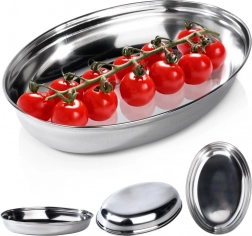 Elegantný oválny táck z kvalitnej nehrdzavejúcej ocele s rozmermi 25,5 × 18 × 4 cm je ideálny na servírovanie jedál, predjedál a občerstvenia. Vďaka odolnému materiálu je nerozbitný, hygienický a ľahko sa čistí, čo oceníte v domácnosti aj profesionálnej gastronómii. Univerzálne využitie v kuchyni, na záhradné párty aj na cestách.