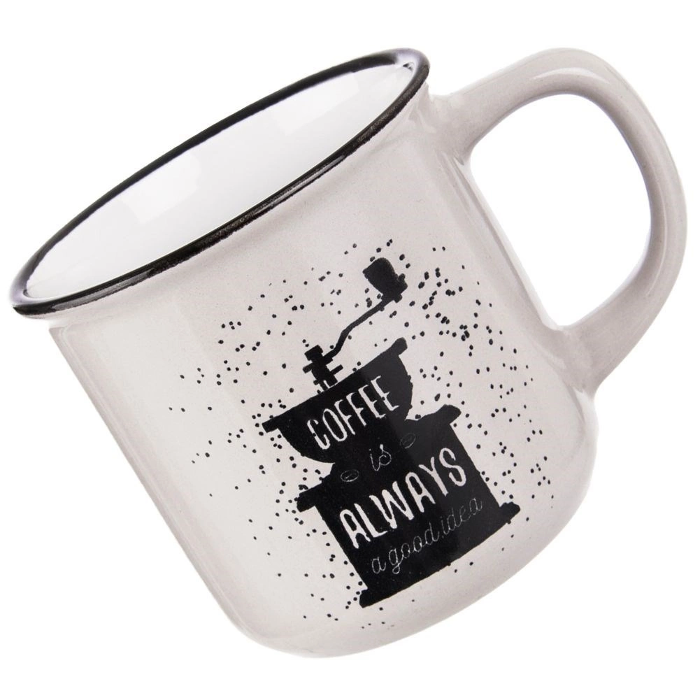 Štýlový keramický hrnček s objemom 370 ml s pohodlným uchom a čiernym dekorom mlynčeka na kávu je ideálny na každodenné pitie. Ponúka odolnú keramiku, ľahkú údržbu v umývačke a použitie v mikrovlnke. Skvele sa hodí na kávu, čaj, kakao aj ďalšie horúce nápoje a vďaka komfortnému uchu sa príjemne drží.