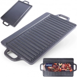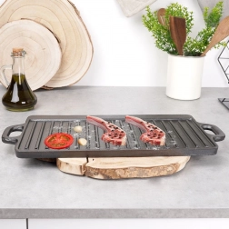 Robustná liatinová doska s rozmermi 45,5 × 23 × 1,5 cm ponúka dve pracovné plochy: hladkú na vyprážanie, pečenie a grilovanie bez odtlačkov a rebrovanú pre výrazné mriežkovanie a odvod prebytočného tuku. Vďaka vysokej akumulácii tepla dosiahnete rovnomerné prepečenie a skvelú chuť ako z vonkajšieho grilu.