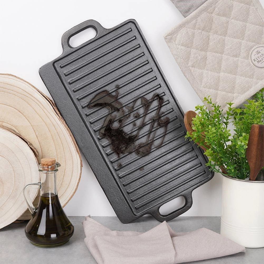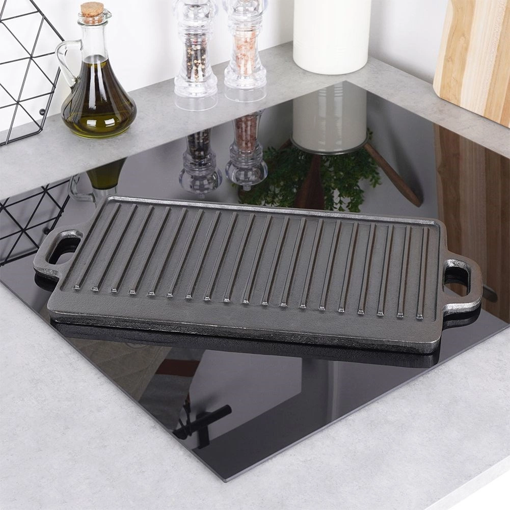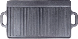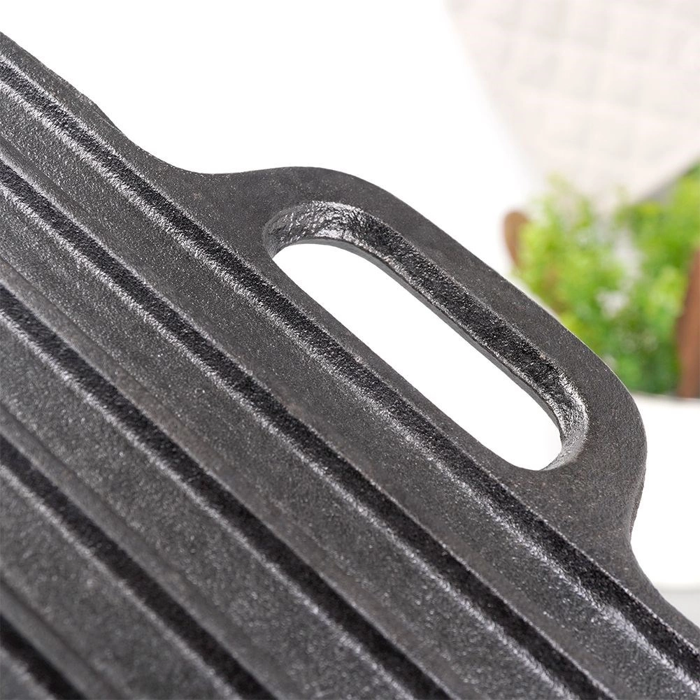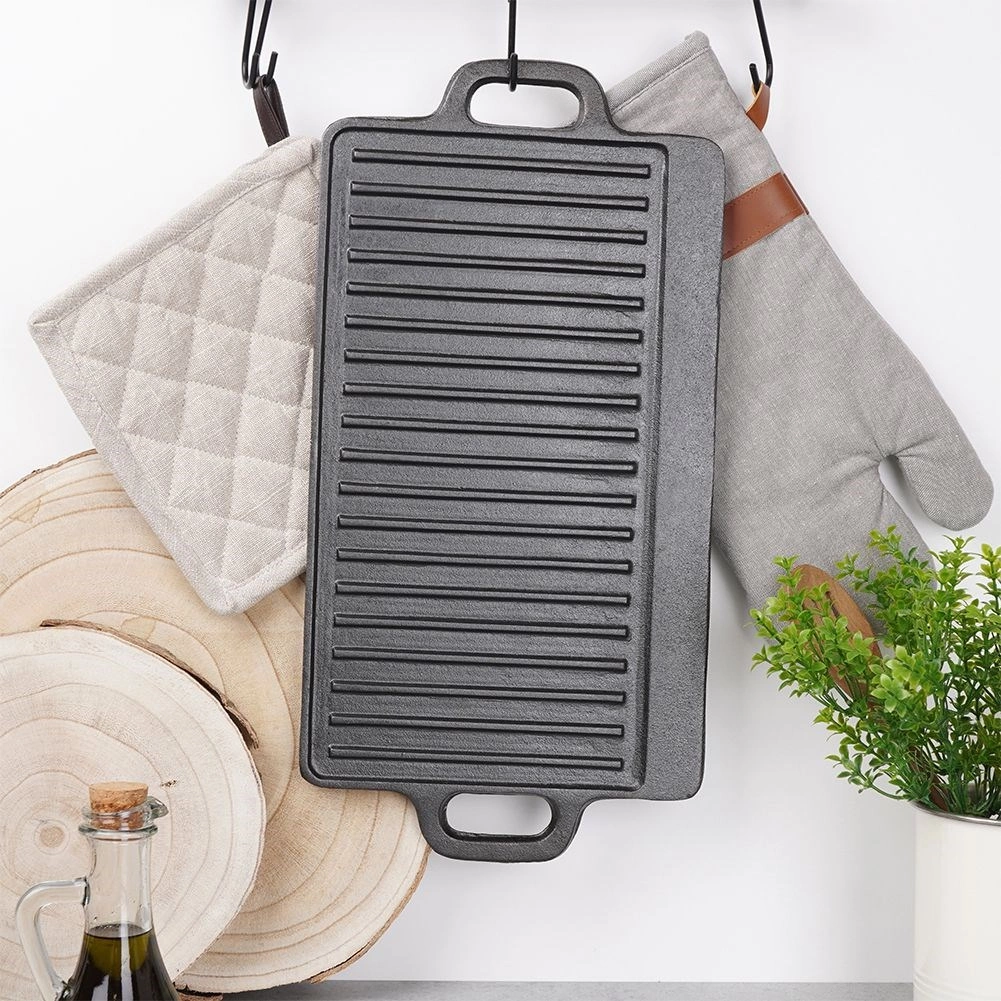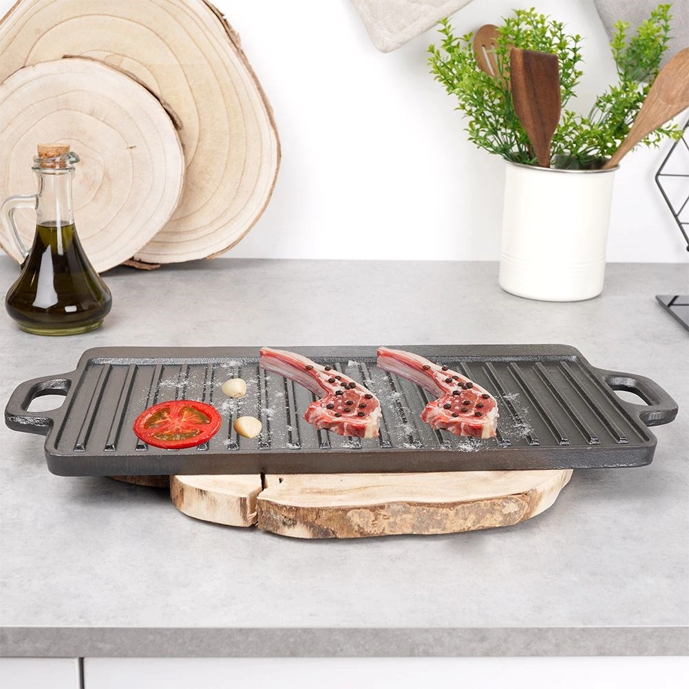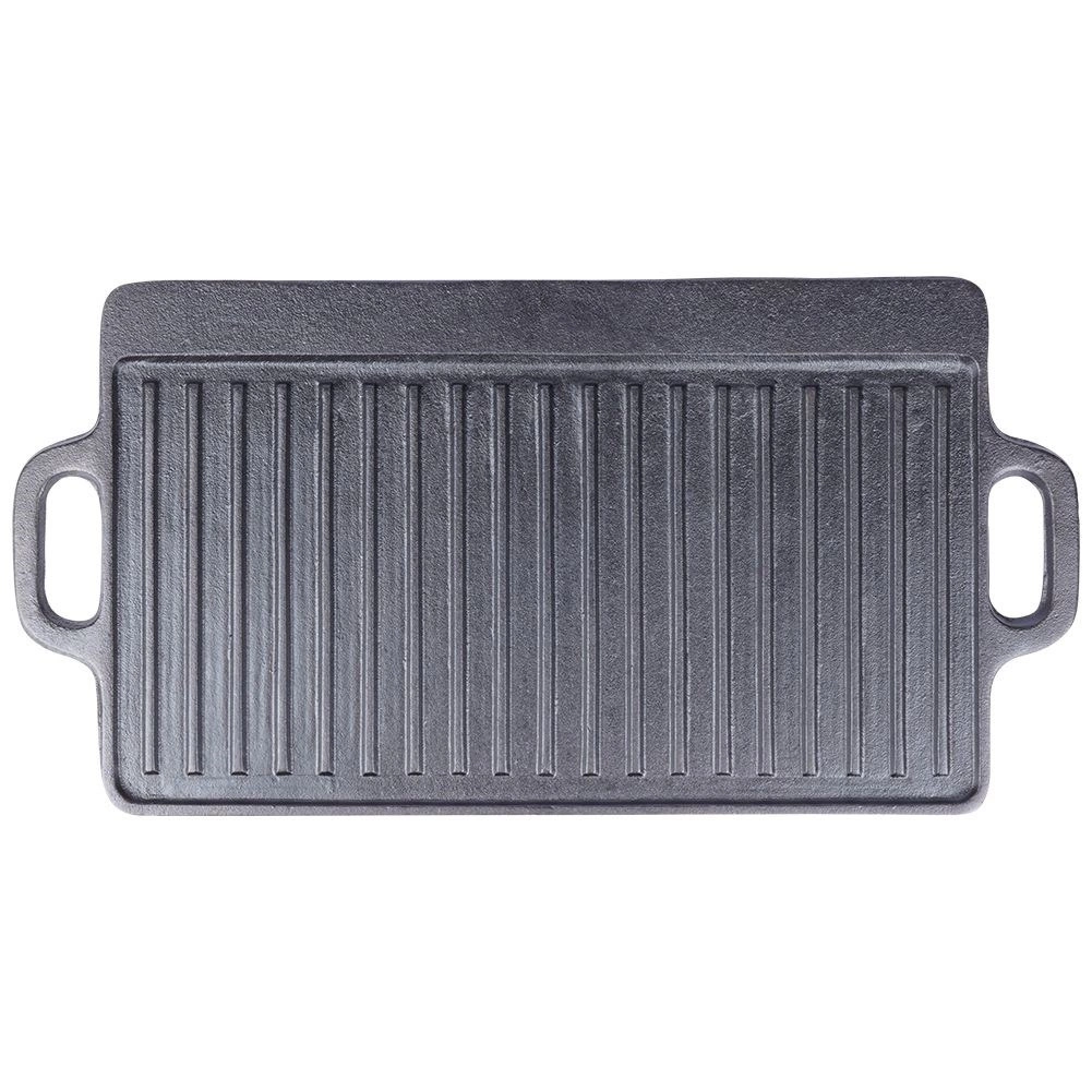 Univerzálna liatinová grilovacia doska na perfektné steaky, ryby aj zeleninu. Vďaka obojstrannému prevedeniu – hladká a rebrovaná strana – pripravíte všetko od palaciniek po šťavnaté steaky. Liatinové telo výborne vedie a udržiava teplo, je odolné a vhodné na sporák, rúru, gril aj oheň, vrátane indukcie.