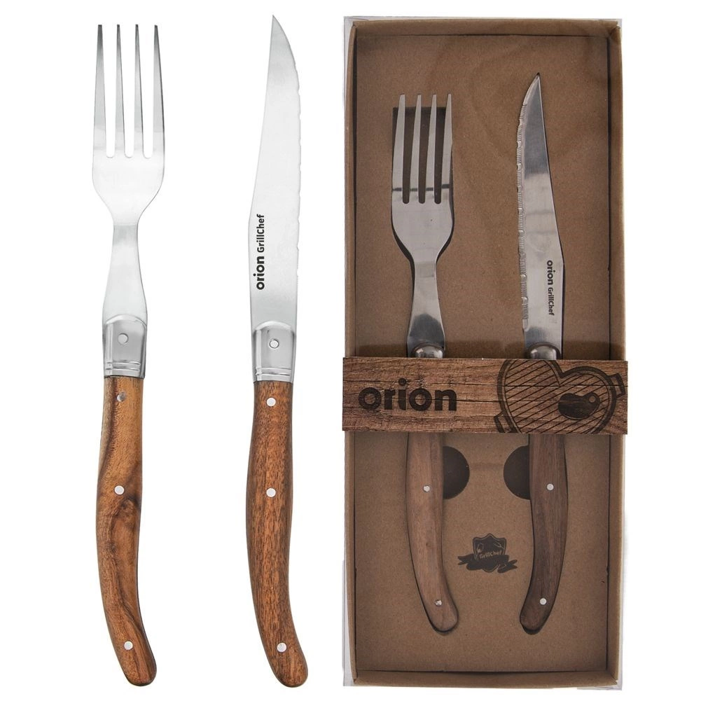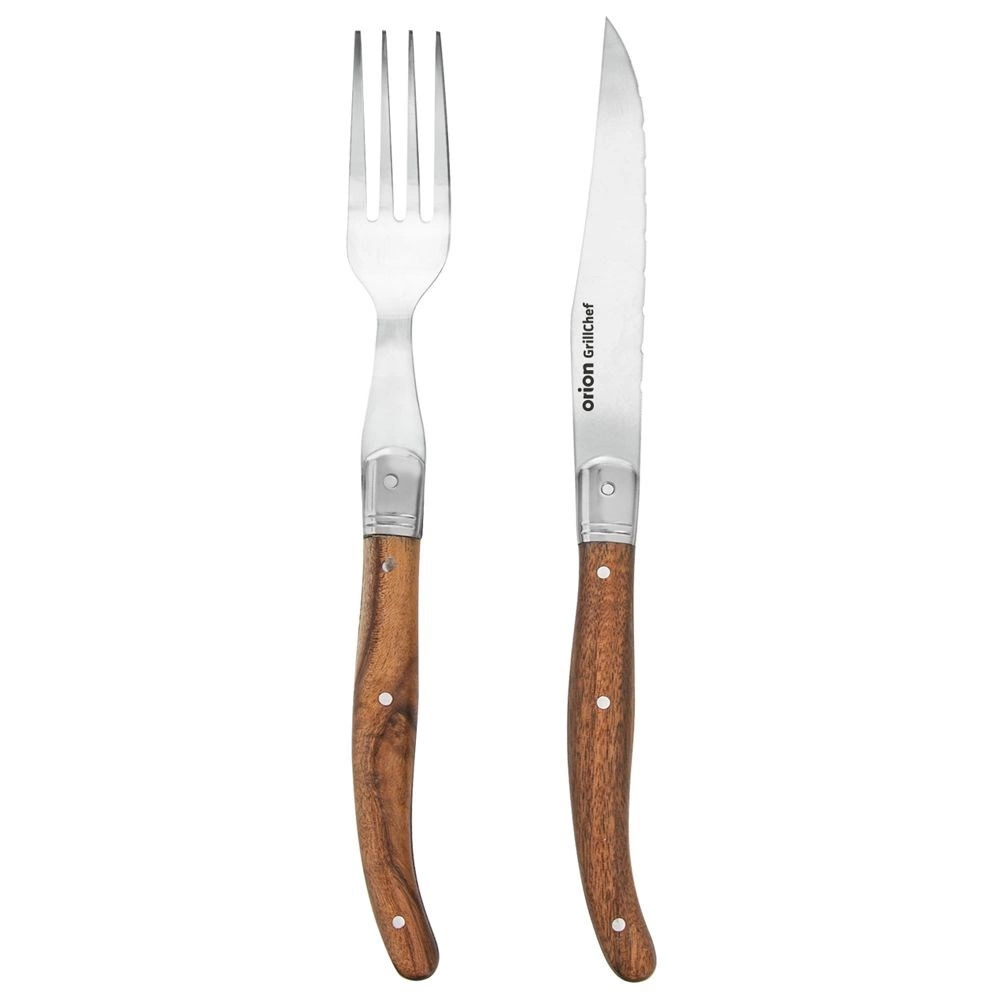 Elegantná sada steakového noža a vidličky pre jednu osobu s kvalitným nehrdzavejúcim ostrím a ergonomickými drevenými rukoväťami. Ideálna na steaky, burgre aj grilovanie. Nôž so zubatým ostrím si poradí aj s tuhším mäsom, rukoväte z akáciového dreva sa skvele držia a zabezpečujú pohodlné a stabilné uchopenie.