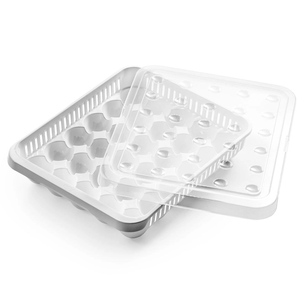 Majte vajcia prehľadne a bezpečne uložené. Tento priestranný box pojme až 30 vajec, má transparentné veko na rýchlu kontrolu zásob a tvarované prehlbne, ktoré držia každé vajce na mieste. Vďaka kompaktným rozmerom 33 × 27 × 7 cm sa ľahko zmestí na väčšinu políc v chladničke a dá sa pohodlne stohovať.