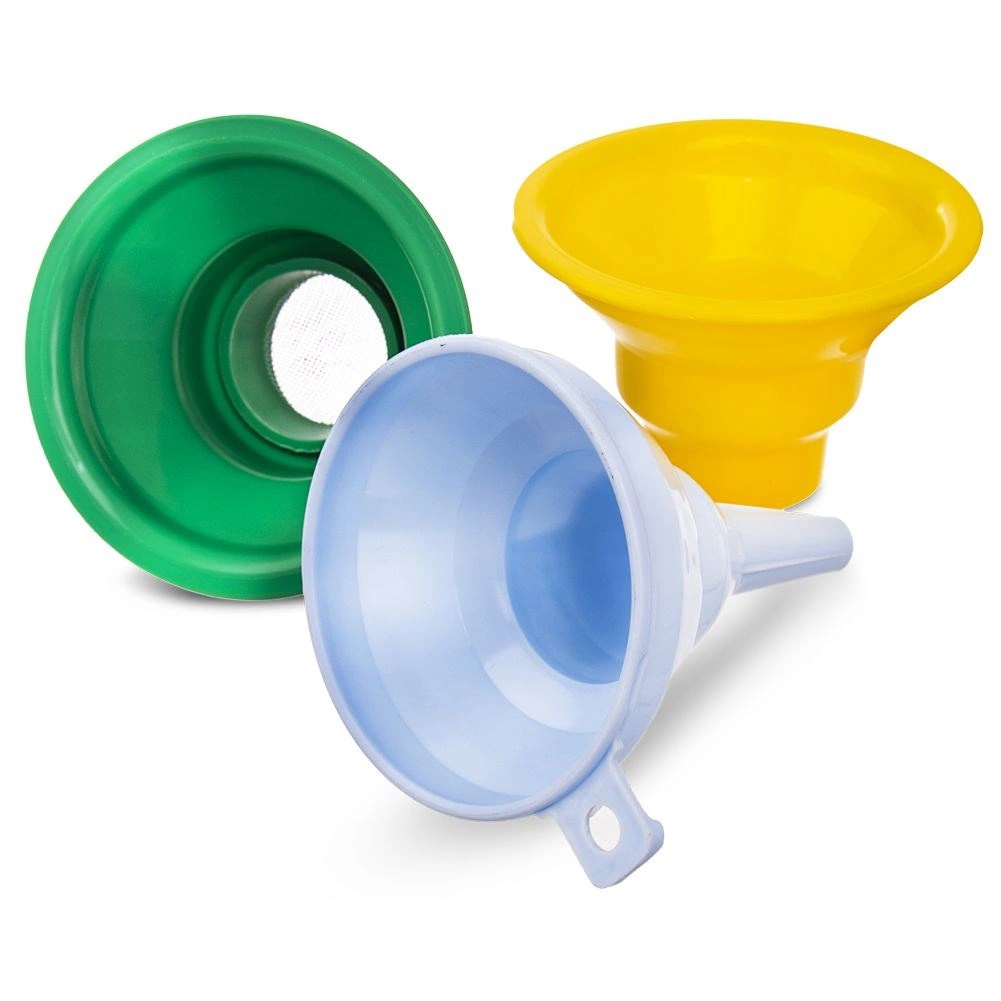 Široké hrdlo a úzky náustok uľahčujú prúdenie tekutín do nádob s úzkym hrdlom, obmedzujú striekanie a neporiadok.