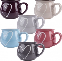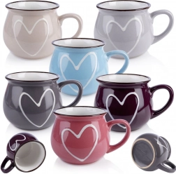 Objavte praktickú a dizajnovú sadu 6 keramických hrnčekov s objemom 320 ml, ideálnu na teplé aj studené nápoje. Každý hrnček zaujme oblým tvarom, pohodlným uškom a dekoratívnym srdiečkom na prednej strane. Lesklá glazúra a kontrastný lem dodávajú elegantný vzhľad, ktorý skvele vynikne na prestretom stole.