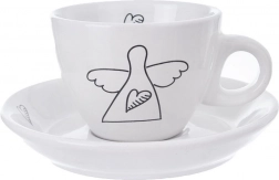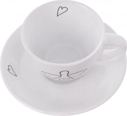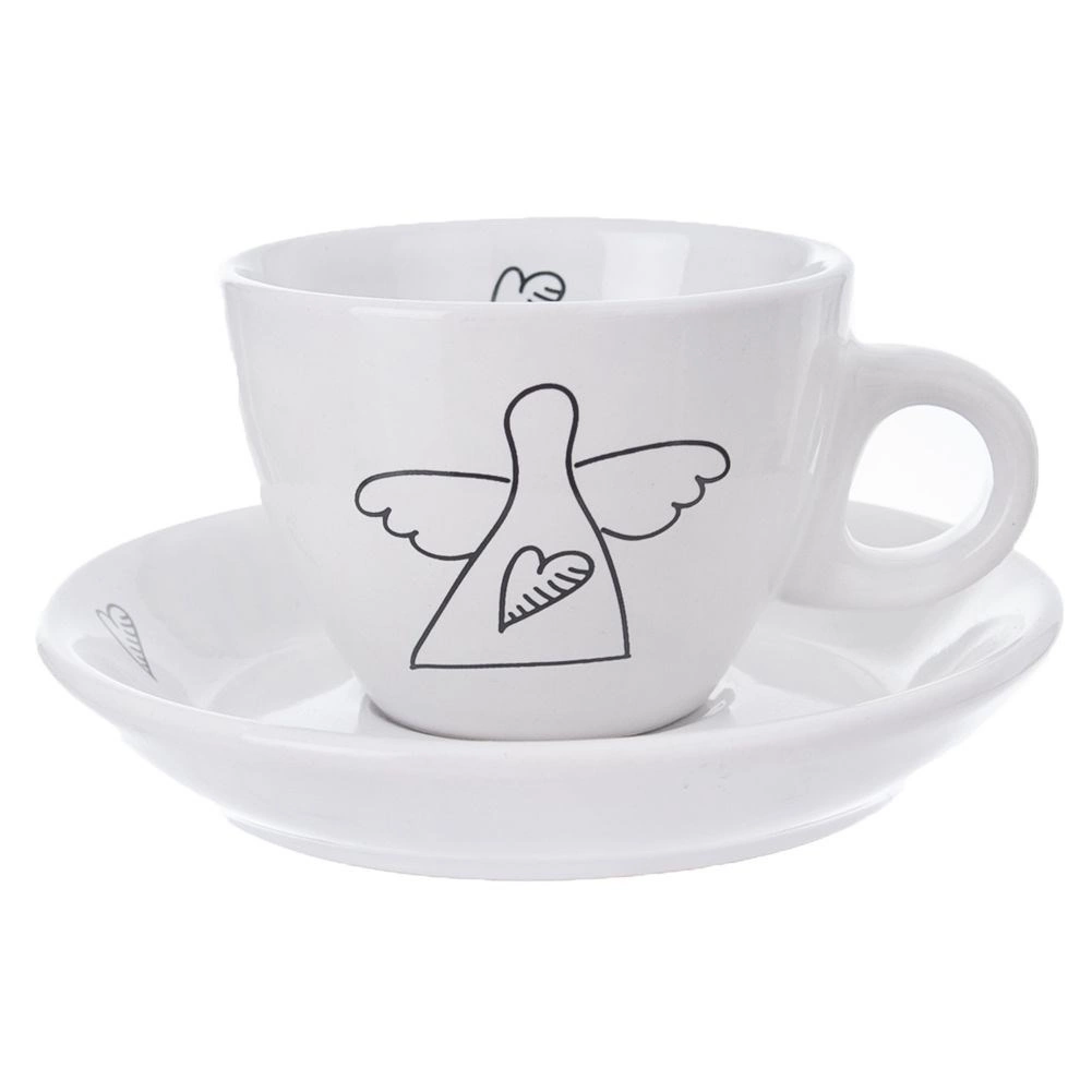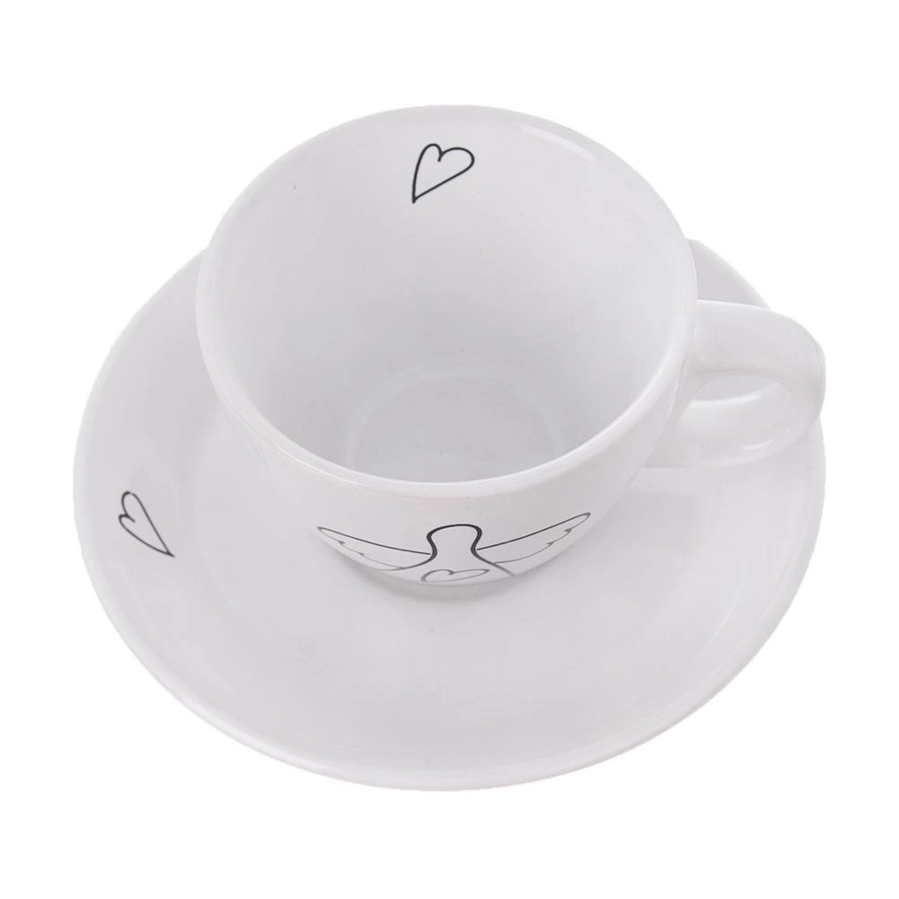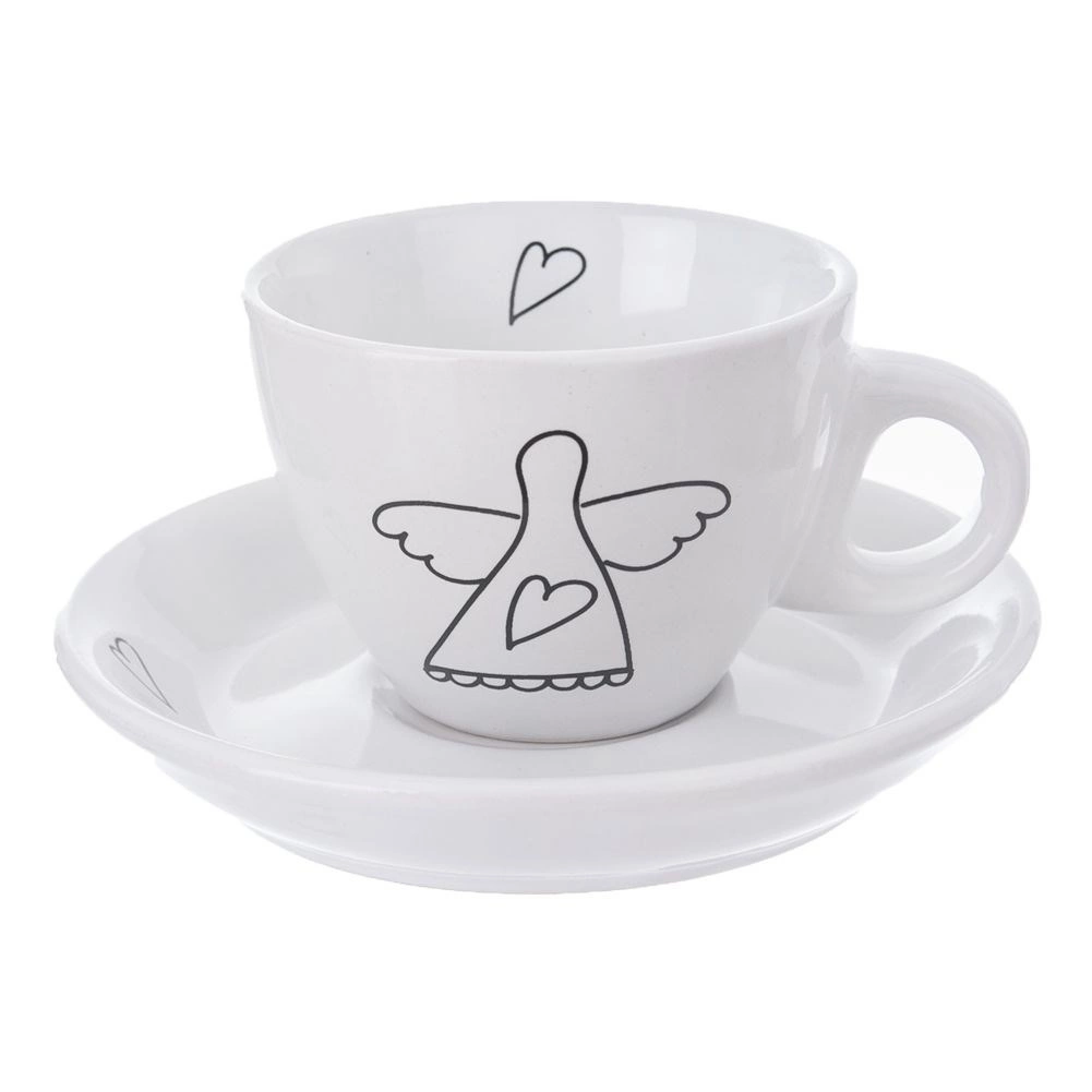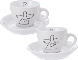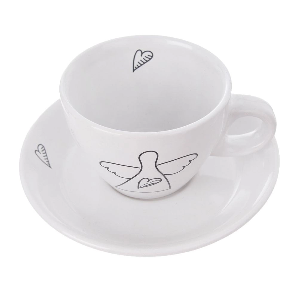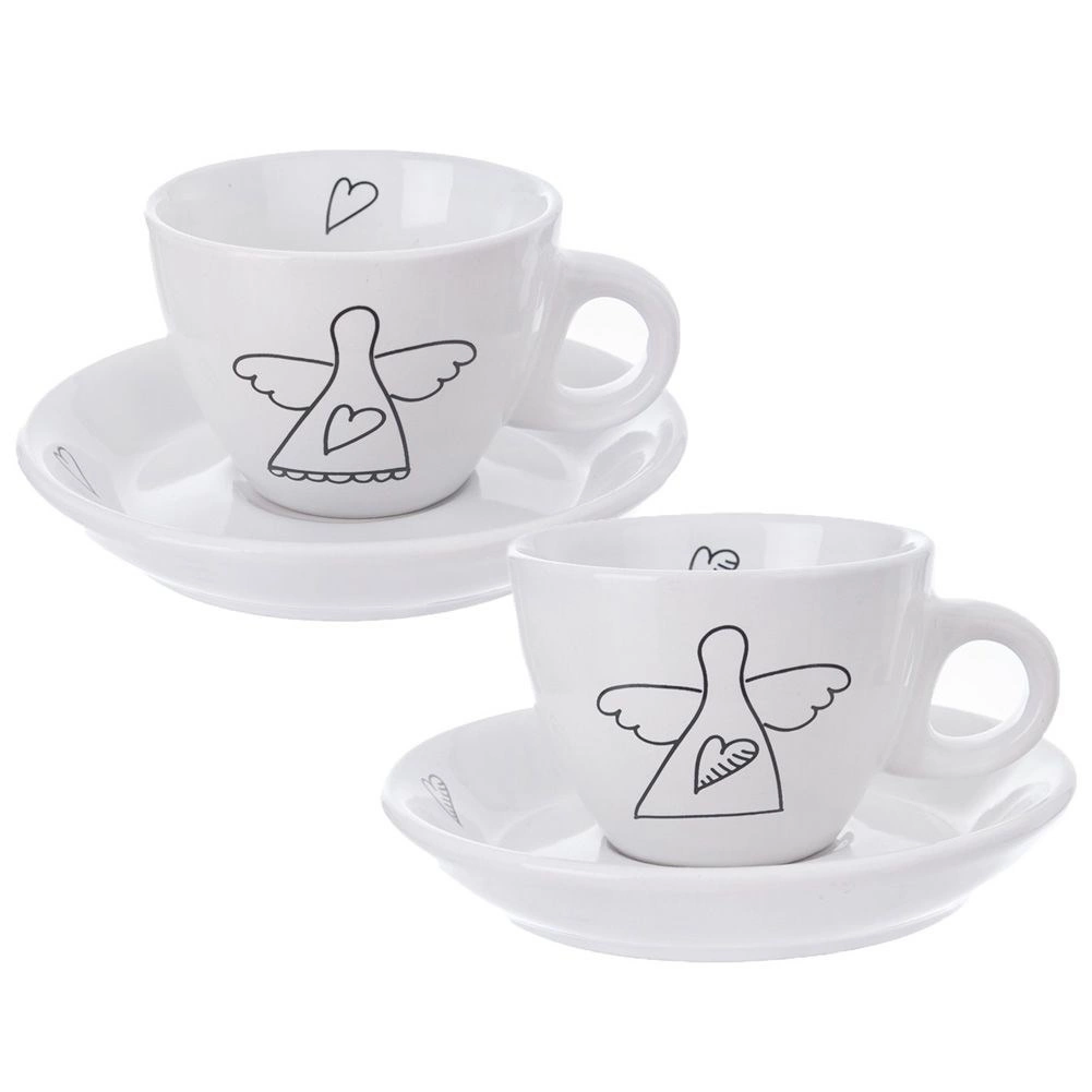 Elegantná sada dvoch espresso šálok s tanierikmi z kvalitnej keramiky v bielej farbe s jemným motívom anjela a sŕdc. Ideálne pre espresso 90 ml, vhodné do umývačky riadu aj mikrovlnnej rúry, s pohodlným uchom a darčekovým balením.