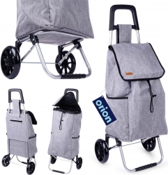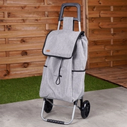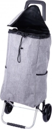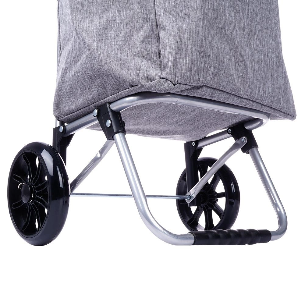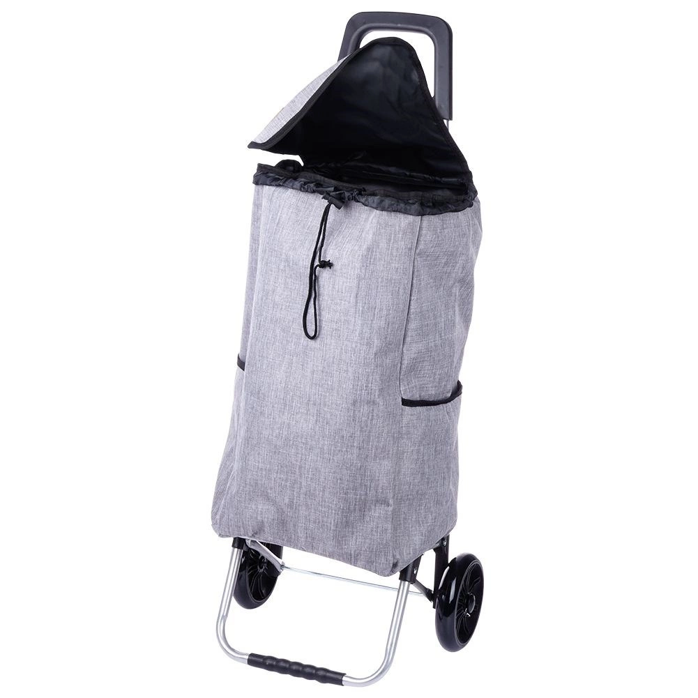 Nákupný vozík so sivou textilnou taškou je navrhnutý na pohodlné a bezpečné prevážanie nákupu. Ľahký, no odolný kovový rám s veľkými plastovými kolesami zabezpečuje stabilitu a plynulý pohyb. Taška je chránená chlopňou a uzatvára sa na sťahovaciu šnúrku, takže obsah ostane v bezpečí aj pri horšom počasí.