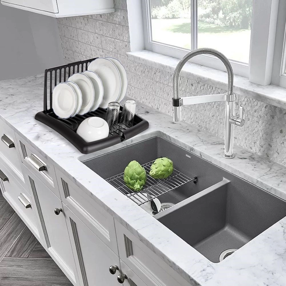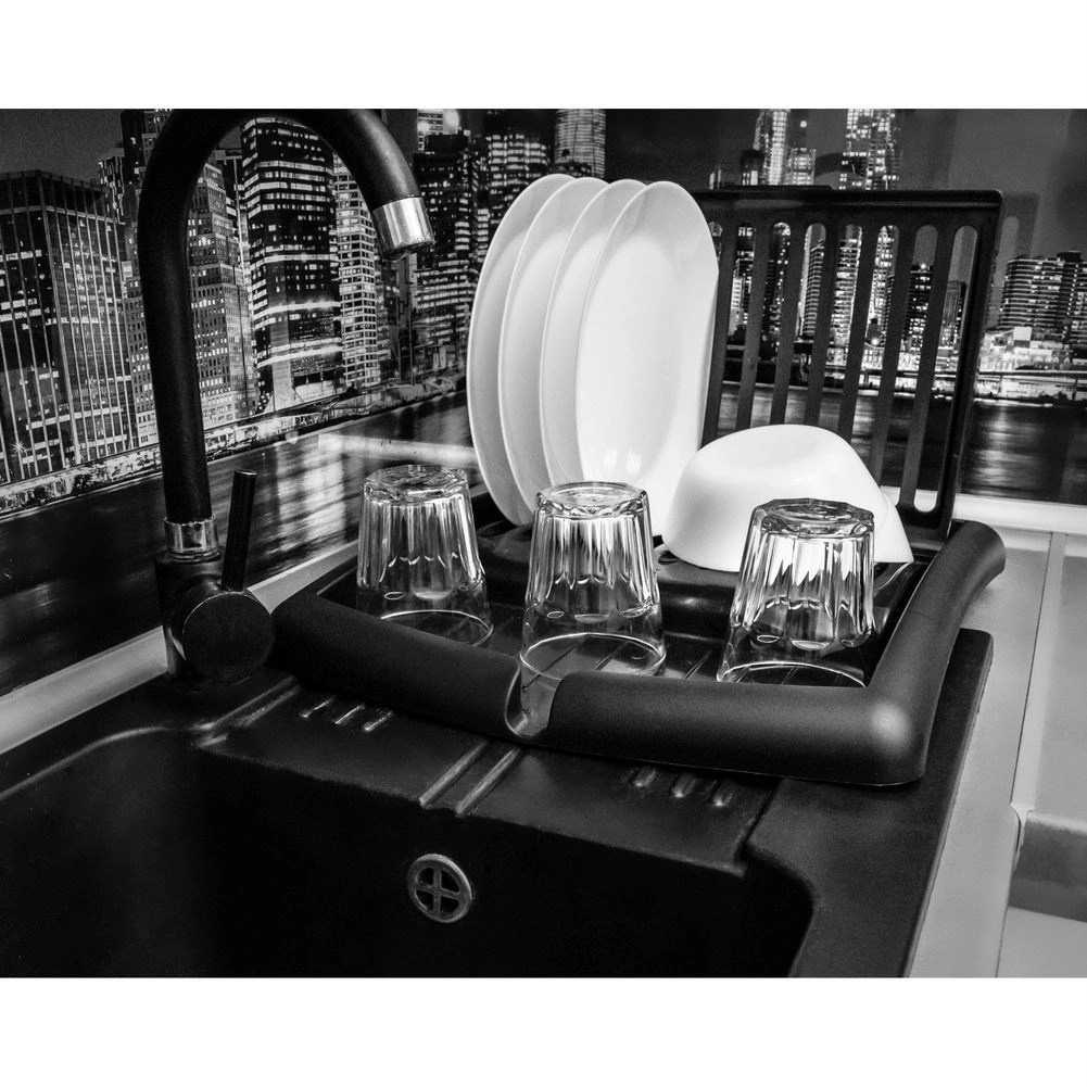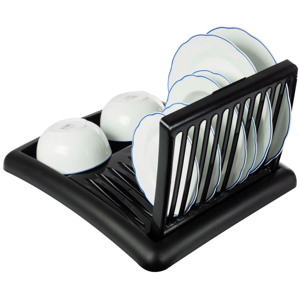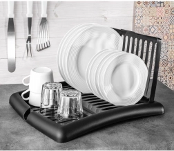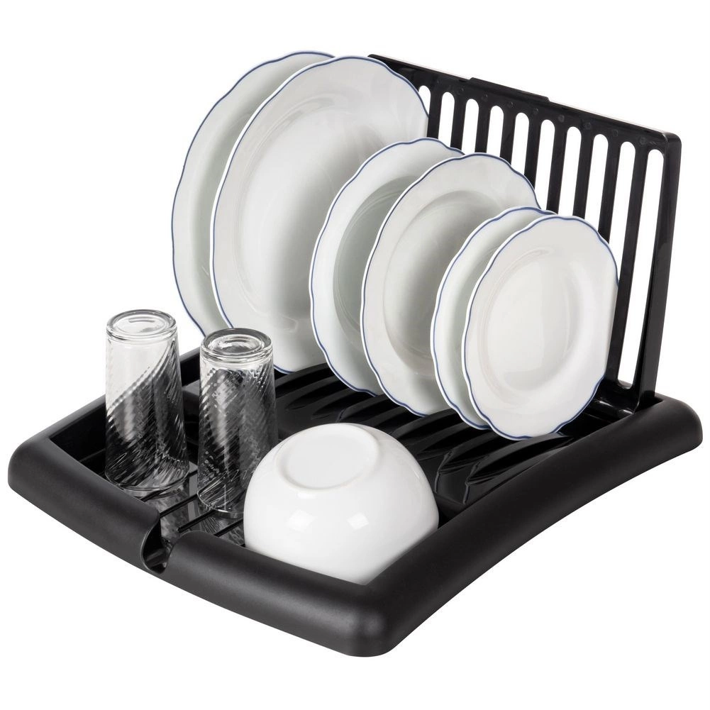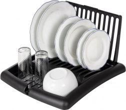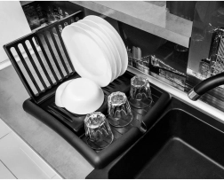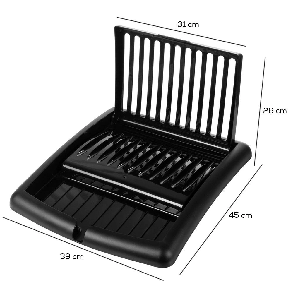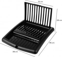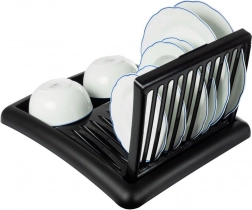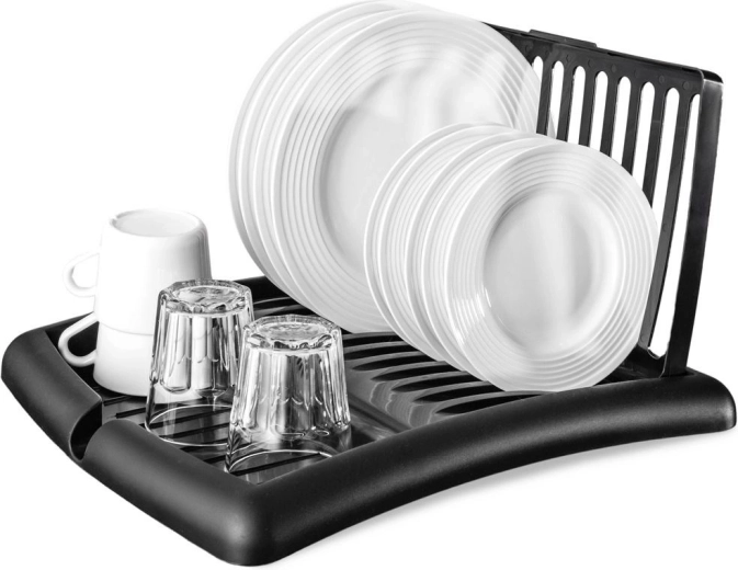 Kompaktný, skladací odkvapkávač na riad v elegantnej čiernej farbe šetrí miesto a udrží vašu kuchyňu v poriadku. Ponúka sloty až pre 11 tanierov, plochu pre hrnčeky a poháre a integrovaný odtokový zobáčik na odvod vody priamo do drezu. Je vyrobený z kvalitného plastu, ktorý je odolný, ľahko sa čistí a nehrdzavie.