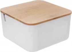 Praktické kozmetické zrkadielko s organizérom s rozmermi 13 × 13 × 7 cm a výškou 16 cm po otvorení. Zrkadlo 11 × 11 cm má rám z bambusového dreva, organizér z odolného bieleho plastu ponúka tri priehradky na šperky, kozmetiku a drobnosti. Skvelá voľba do kúpeľne aj spálne, ideálne aj na cesty vďaka skladacej konštrukcii.