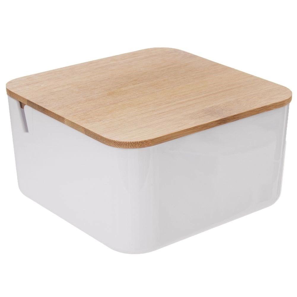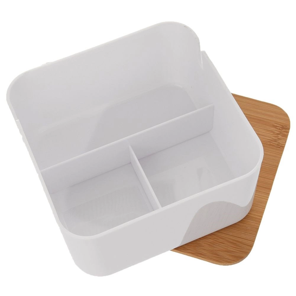 Elegantné a funkčné riešenie pre každodennú starostlivosť: kozmetické zrkadielko s organizérom, ktoré šetrí miesto a udržiava všetko potrebné poruke. Kombinácia bieleho plastu a bambusového dreva pôsobí moderne a hodí sa do každého interiéru.