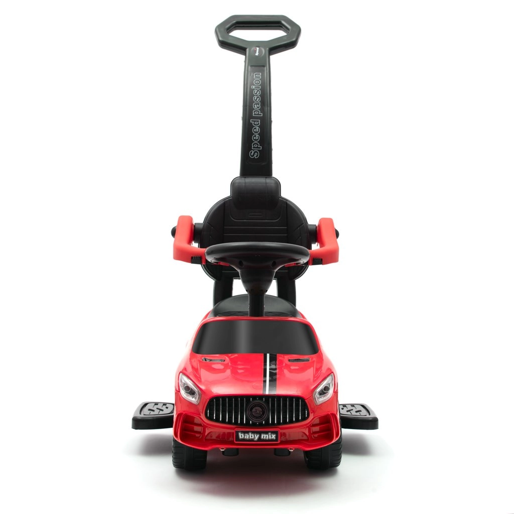 Červené odrážadlo BABY MIX Racer je ideálny spoločník pre prvé jazdy malých pretekárov. Ponúka vodiacu tyč na jednoduché ovládanie, bezpečnostné bočné operadlá, sklopné stúpačky a zvukový panel pre väčšiu zábavu. Vďaka kvalitnej a odolnej konštrukcii, tvarovanému sedadlu s operadlom a blokáde proti prevráteniu je jazda pohodlná a bezpečná doma aj vonku.