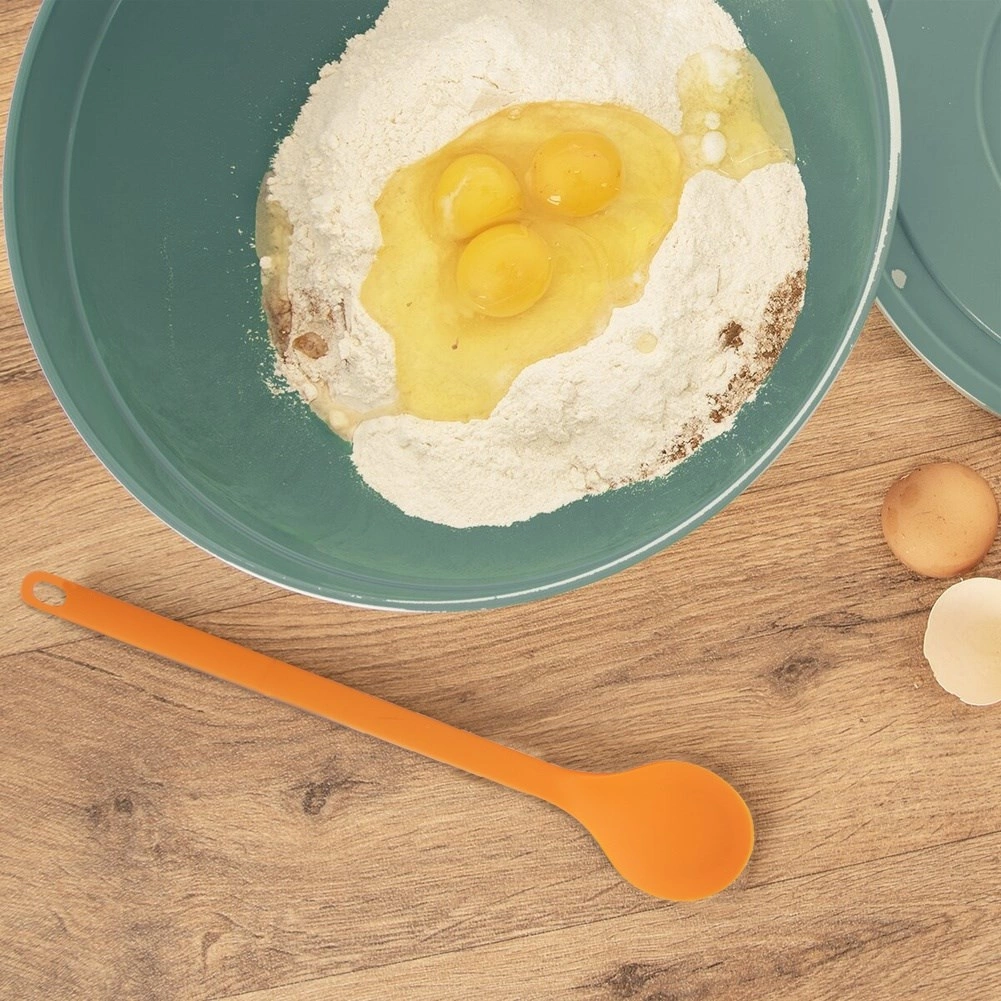 Vďaka kovovému vystuženiu vo vnútri si lyžica drží tvar a zvládne aj hustejšie cestá či ťažšie zmesi. Protišmyková rukoväť skvele padne do ruky a očko na konci umožní zavesenie na lištu. Materiál neabsorbuje pachy ani tekutiny a možno ho umývať v umývačke, takže údržba je rýchla a hygienická.