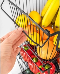 Premyslená konštrukcia s čelným výrezom umožňuje rýchle a pohodlné vyberanie potravín, otvorené drôty podporujú viditeľnosť a prúdenie vzduchu pre dlhšiu čerstvosť. Štyri stabilné nožičky chránia povrch pracovnej dosky a zaisťujú pevné postavenie košíka.