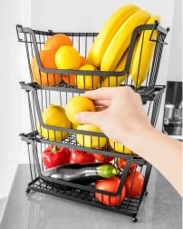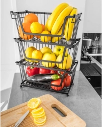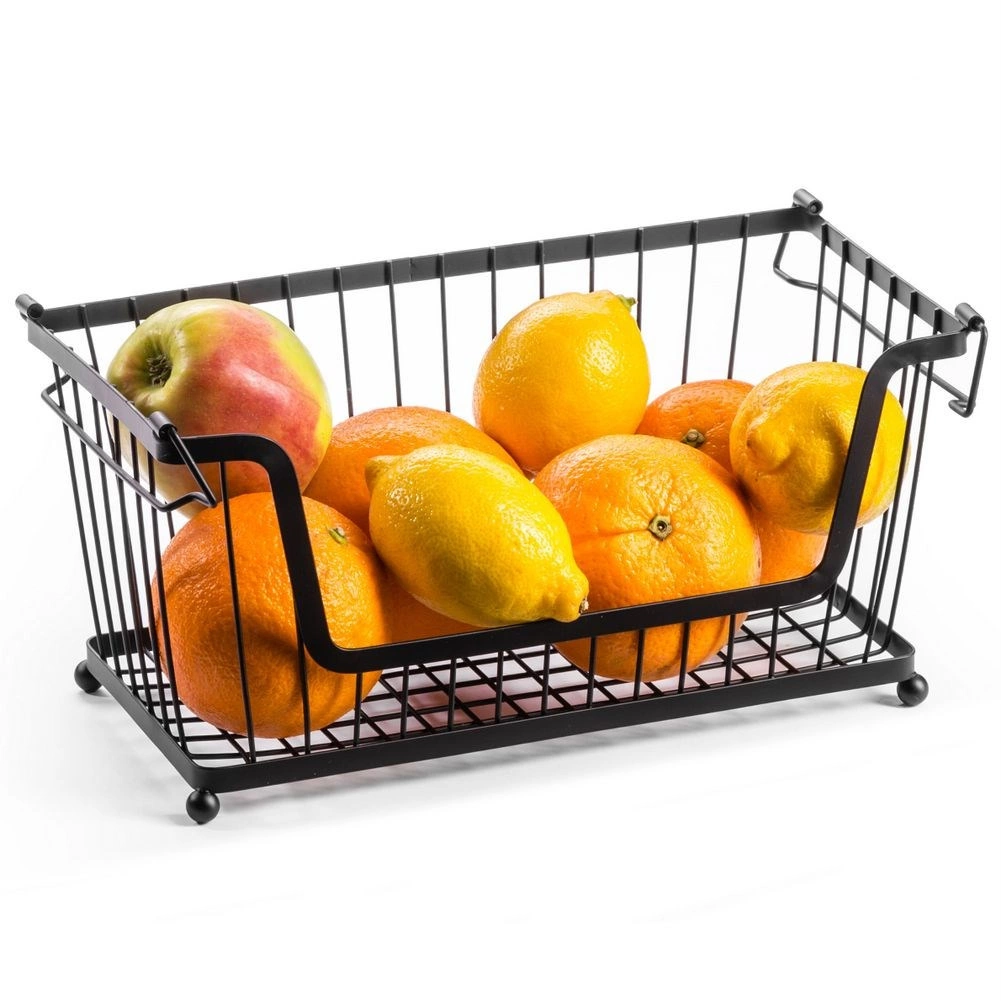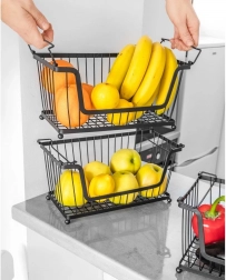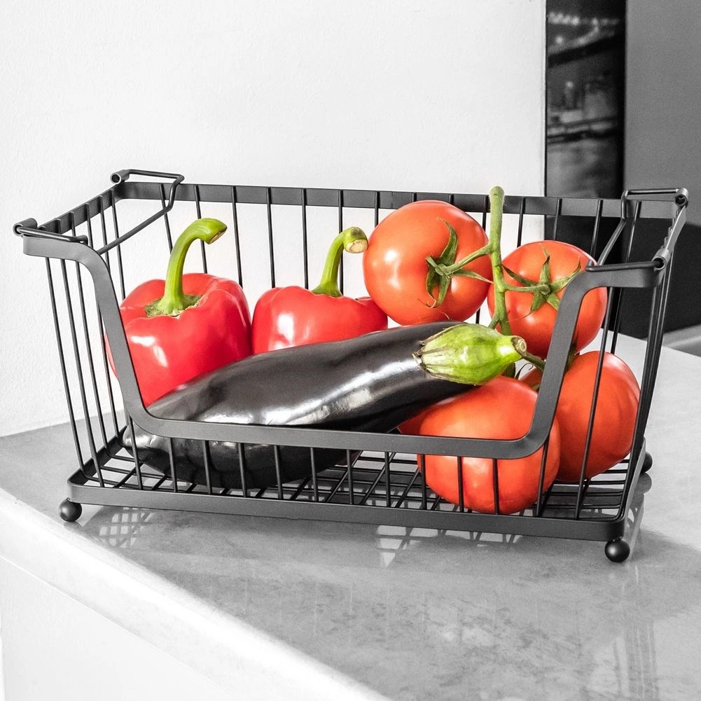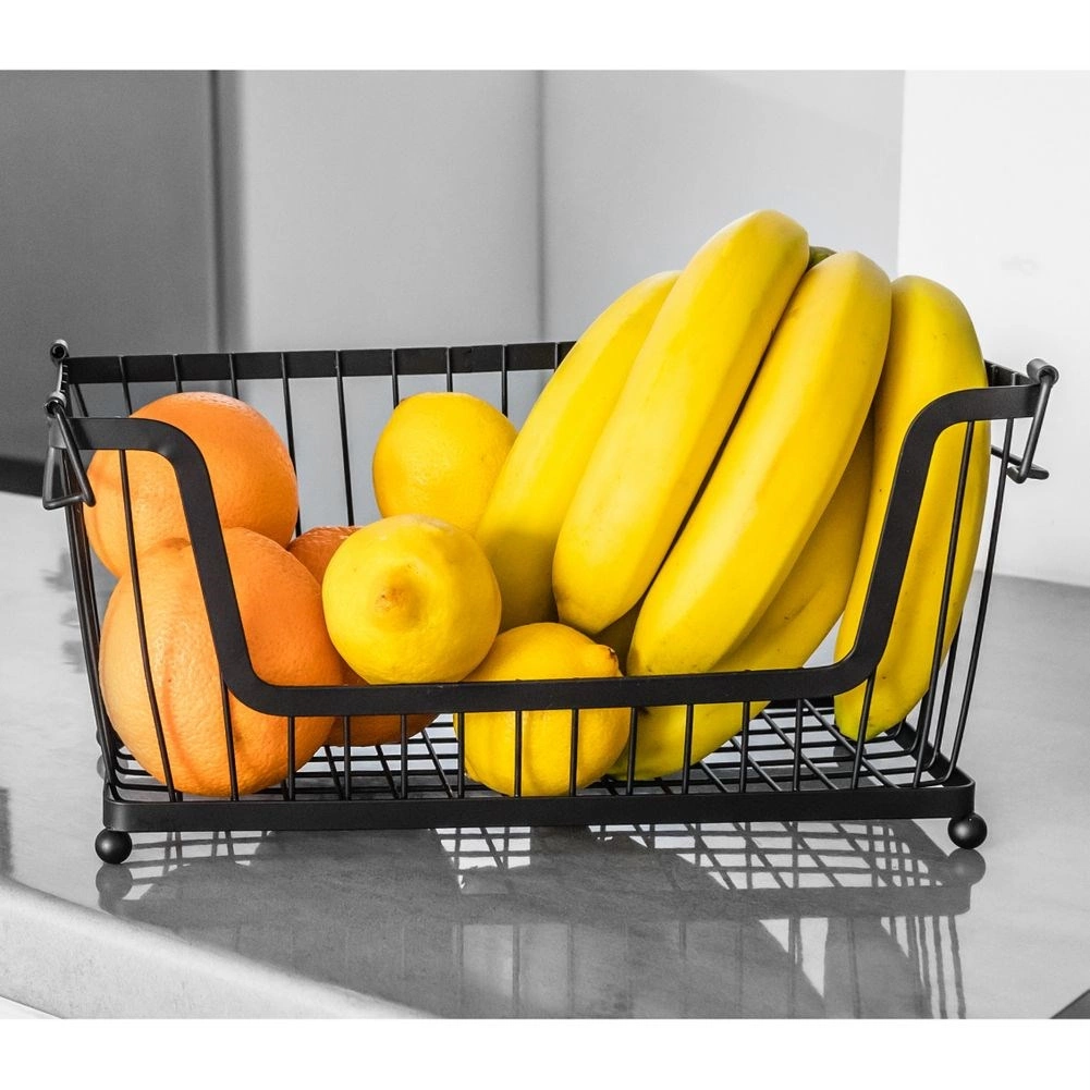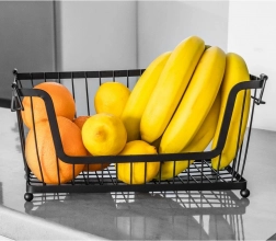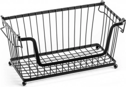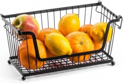 Praktický a odolný košík s rozmermi cca 31 × 17,5 × 15,5 cm je ideálny na prehľadné uloženie ovocia, zeleniny aj kuchynských doplnkov. Práškovaný lakovaný kov v elegantnej čiernej farbe sa hodí do interiérov v štýle loft, industrial aj moderný glamour a zároveň je nenáročný na údržbu.