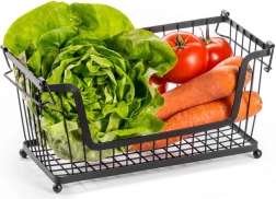 Otvorené drôtené steny s nižším čelným okrajom poskytujú prehľad a rýchly prístup k obsahu, zvýšené nožičky zabezpečujú stabilitu a hygienu na pracovnej doske. Bočné rukoväte umožnia pohodlné prenášanie aj s obsahom. Pri zaobstaraní viacerých kusov ich možno bezpečne ukladať na seba a vytvoriť tak praktický viacposchodový stojan.
