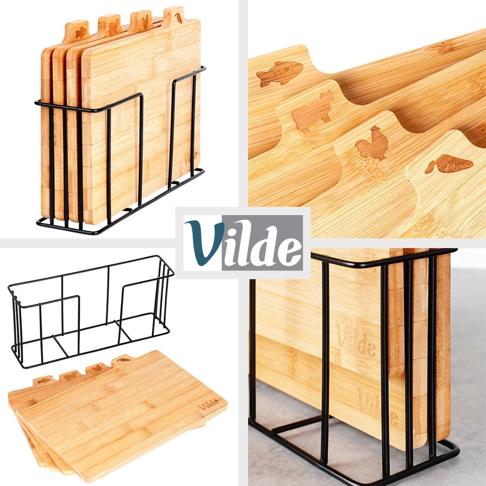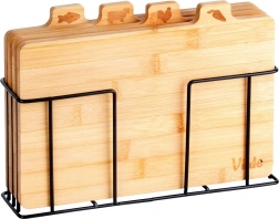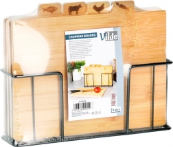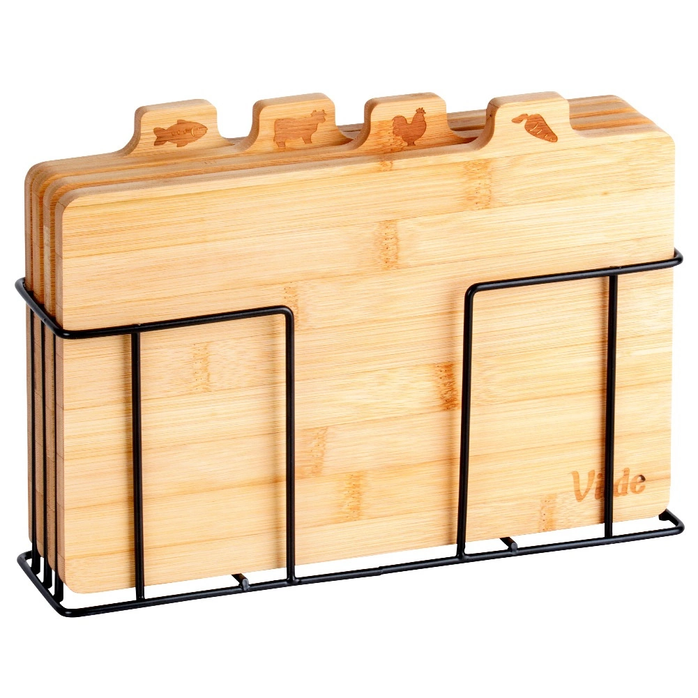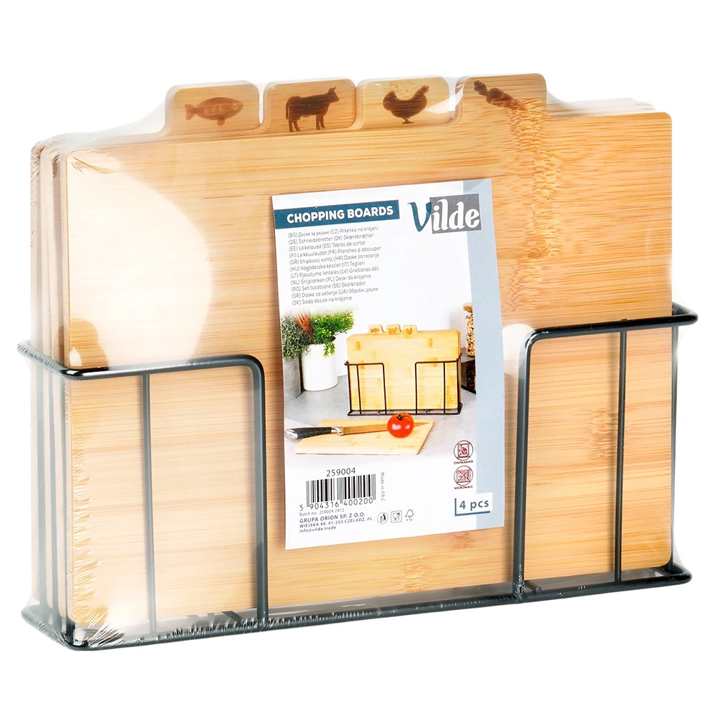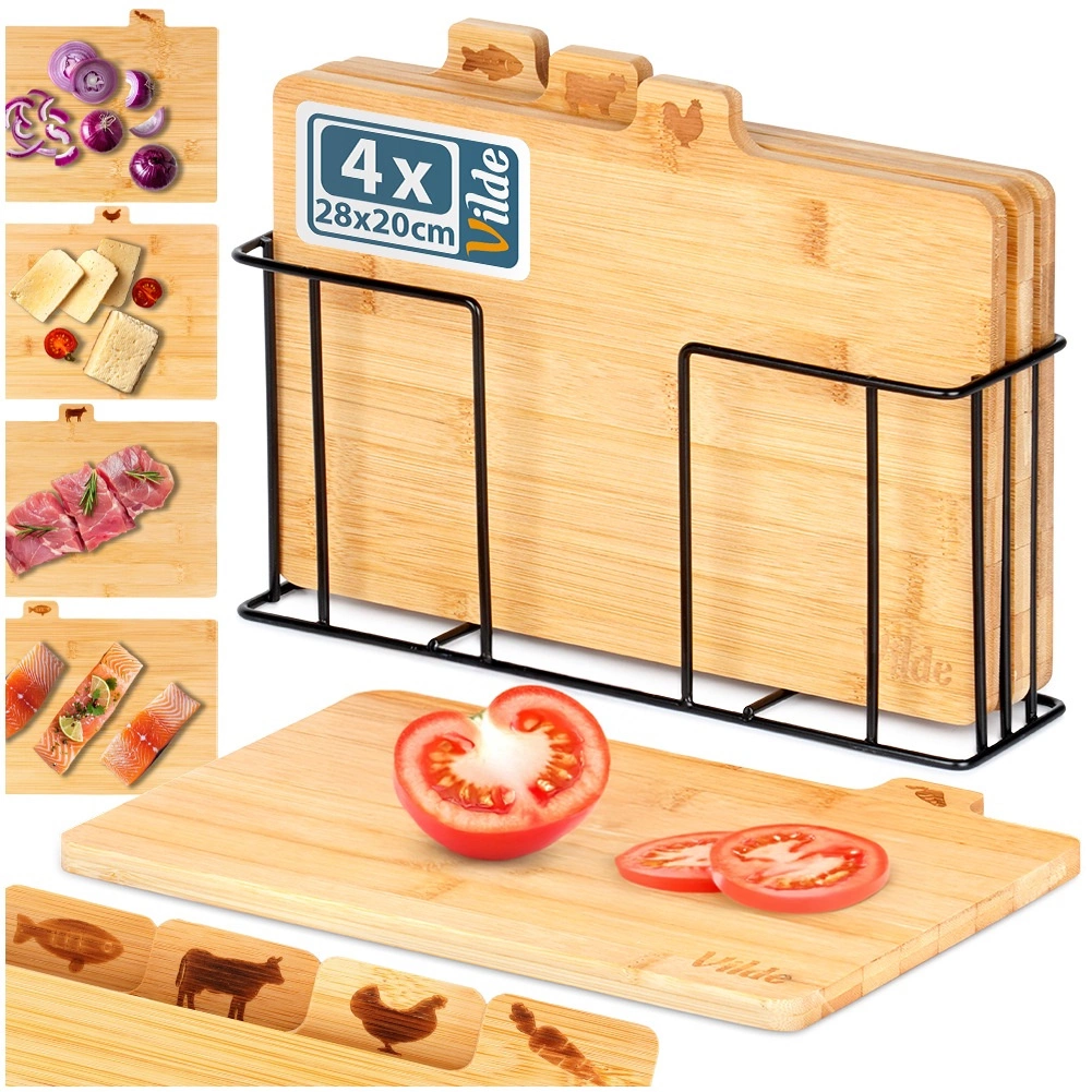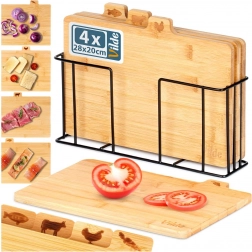 S touto sadou bambusových dosiek udržíte kuchyňu v dokonalom poriadku. Štyri samostatné dosky s praktickými záložkami a ikonami jasne určia, na čo ich použiť – pre zeleninu, hydinu, mäso a ryby – a tým podporíte hygienickú prípravu jedál. Stabilný kovový stojan v čiernej farbe zaistí, že budú dosky vždy po ruke a úhľadne uložené.