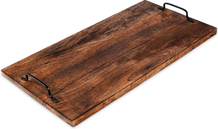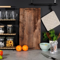 Dva kovové úchyty zabezpečujú bezpečný úchop a pohodlné prenášanie z kuchyne priamo na stôl. Povrch s výraznou kresbou dreva a postaršeným vzhľadom dodá vášmu stolovaniu rustikálny nádych a moderný štýl.