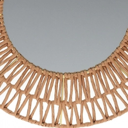 Toto okrúhle nástenné zrkadlo je dizajnovým doplnkom v prírodnom štýle. Rám z pleteného papiera na pevnej kovovej konštrukcii vytvára efektnú štruktúru, ktorá vynikne v interiéroch v duchu boho, škandinávskeho či moderného minimalizmu. Neutrálne béžovo‑sivé tóny sa ľahko kombinujú s rôznymi farbami aj materiálmi.