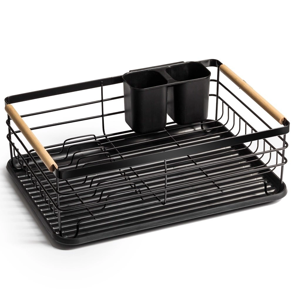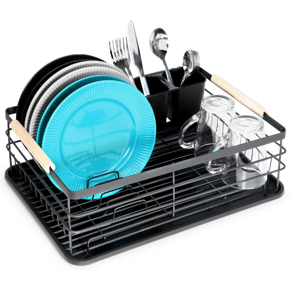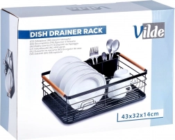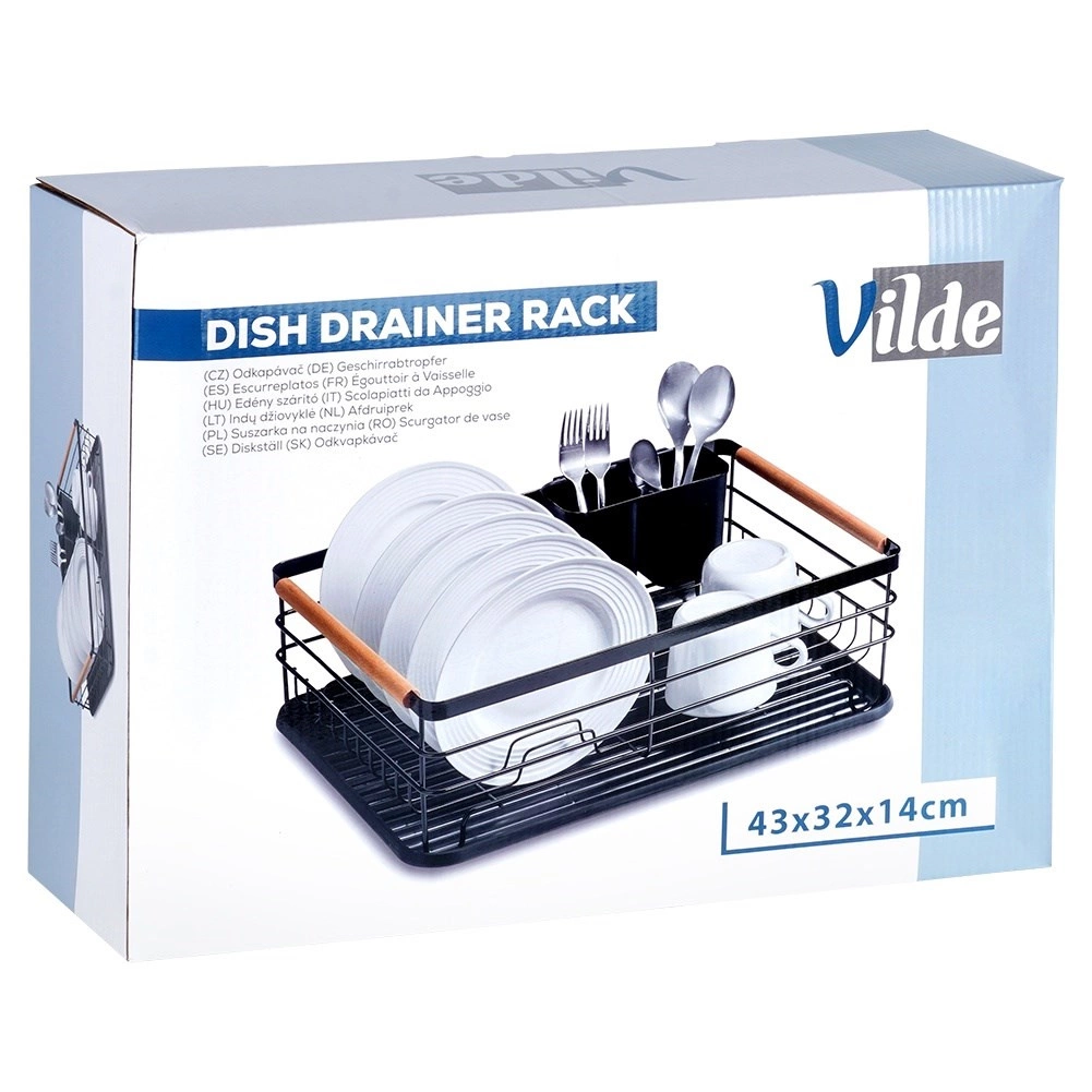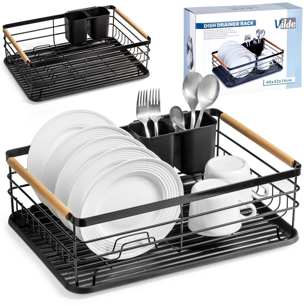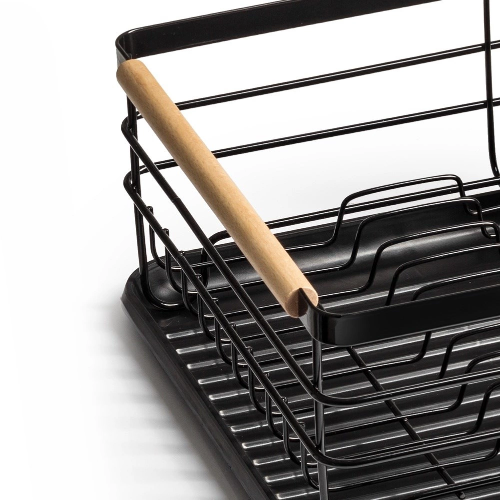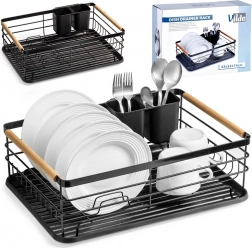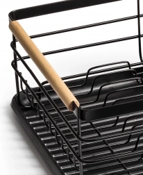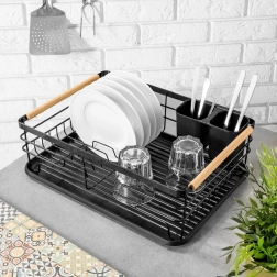 Praktický odkvapkávač na riad s rozmermi 43 × 32 × 14,5 cm uľahčí sušenie a organizáciu tanierov, pohárov a príborov a zároveň ochráni kuchynskú linku. Je vyrobený z odolného kovu v čiernej farbe, má vyberateľnú odkvapkávaciu tácku a dvojkomorový košík na príbory. Vďaka kapacite až na 10 tanierov, pevnej drôtenej konštrukcii a dreveným bambusovým úchytom je pohodlný na prenášanie aj každodenné používanie. Štýlový industriálny dizajn skvele zapadne do modernej aj klasickej kuchyne.