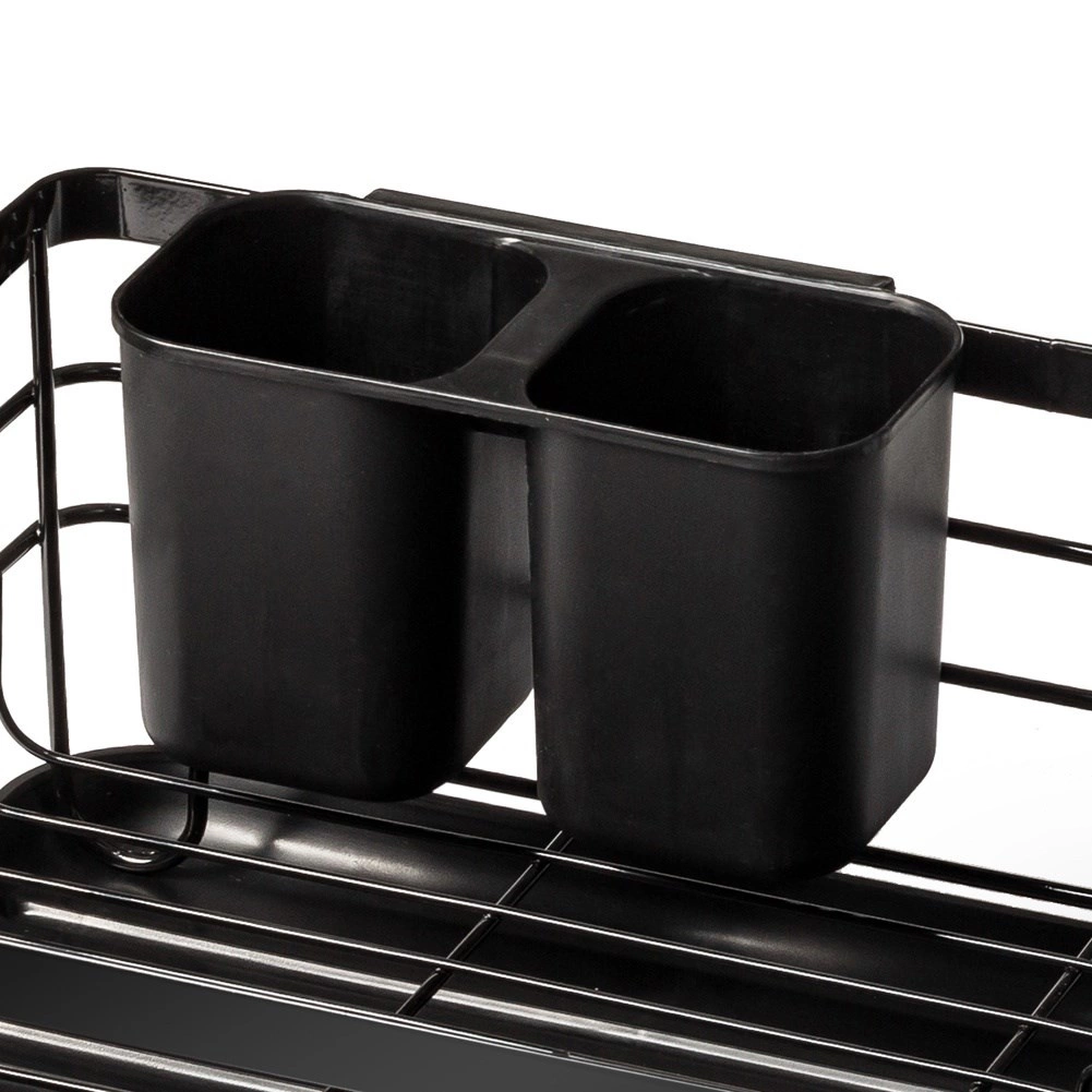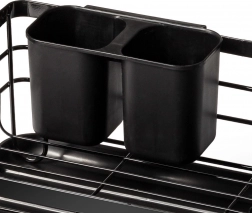 Elegantný a funkčný odkvapkávač na riad pomôže udržať kuchyňu čistú a organizovanú. Čierne kovové prevedenie s prírodnými bambusovými madlami spája odolnosť s moderným vzhľadom. Vyberateľná odkvapkávača miska spoľahlivo zachytí vodu a uľahčí čistenie, zatiaľ čo dvojkomorový košík na príbory môžete umiestniť dovnútra alebo zvonka podľa potreby.