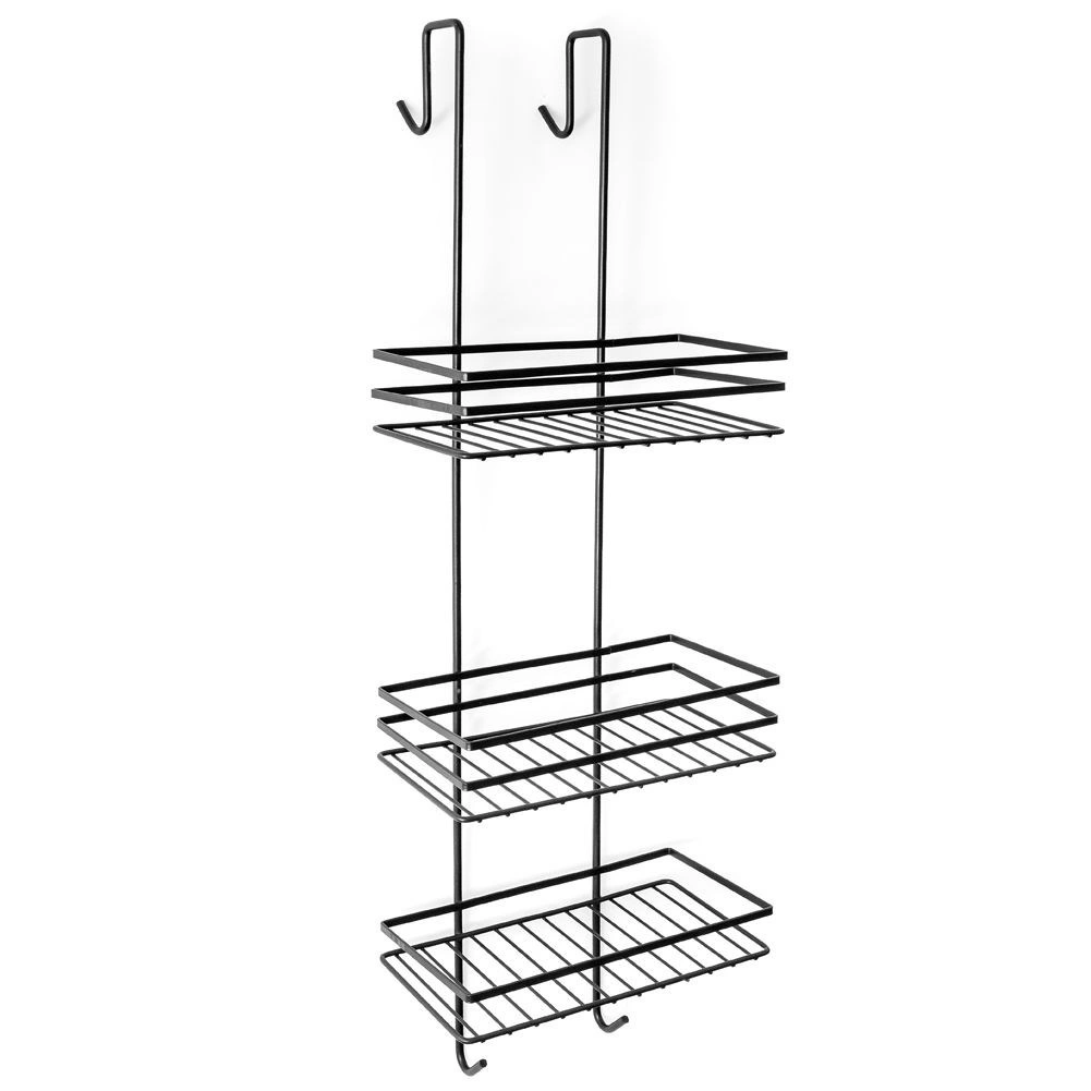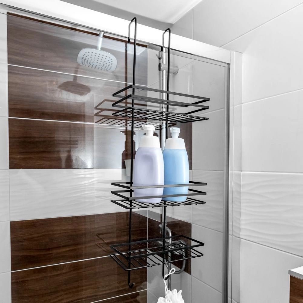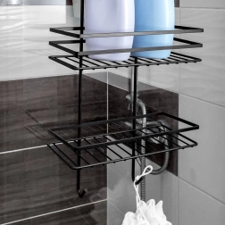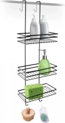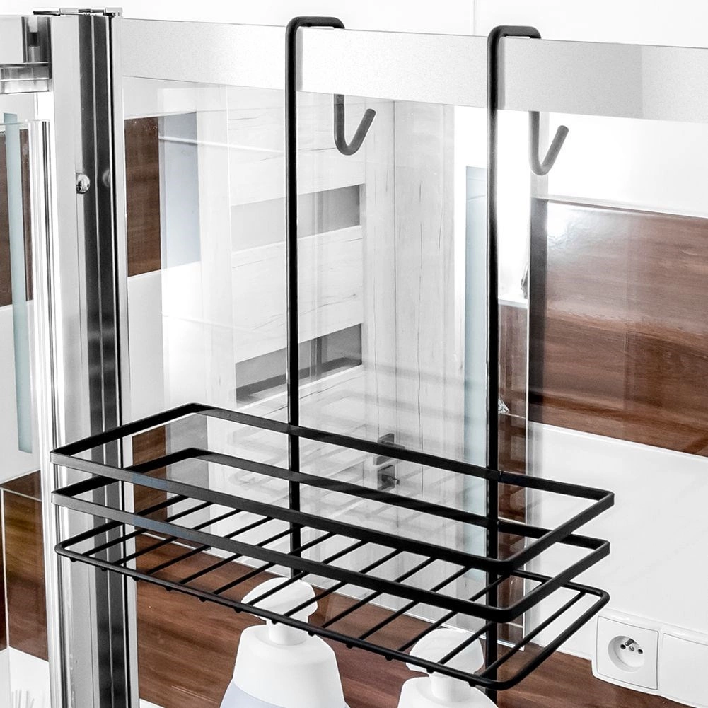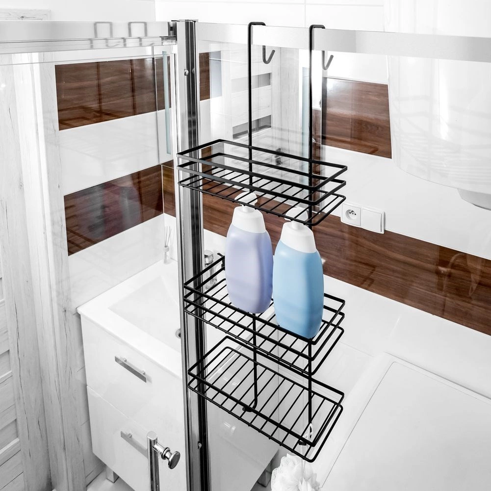 Praktická závesná sprchová polička v elegantnej čiernej farbe udrží všetky vaše nevyhnutnosti prehľadne na dosah. Ponúka tri priestranné police na šampóny a gély, štyri háčiky na hubky a kefy a montáž bez vŕtania zavesením cez hornú hranu sklenených dverí sprchy. Odolný kov s práškovým lakom zaisťuje dlhú životnosť a jednoduchú údržbu.