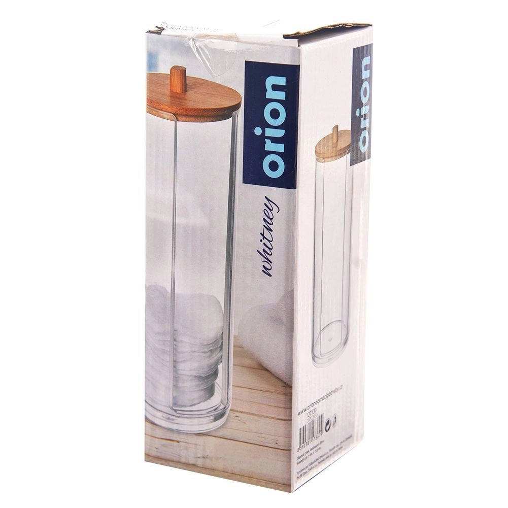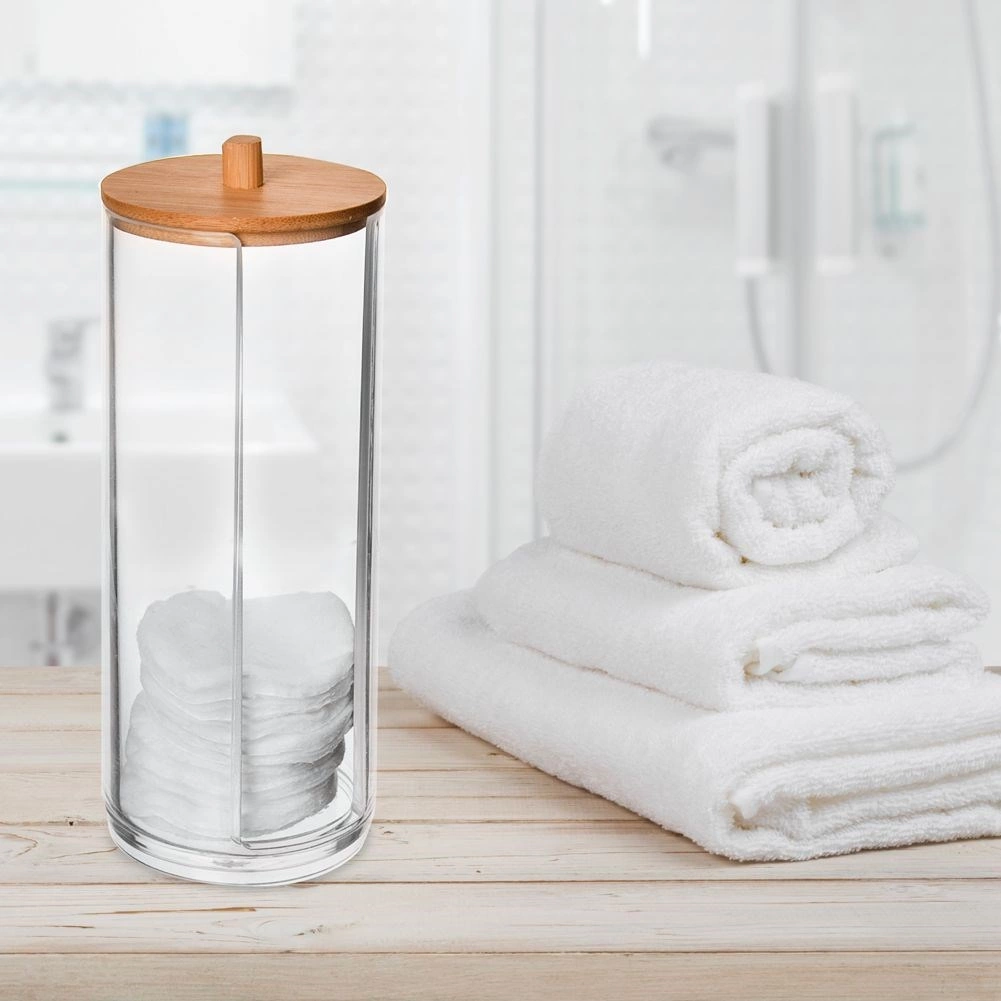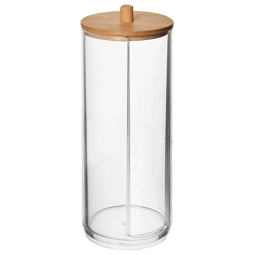 Elegantný dávkovač na kozmetické tampóny z transparentného akrylu s bambusovým viečkom udrží vašu kúpeľňu upratanú a tampóny vždy po ruke. Má praktický predný otvor na jednoduché vyberanie jednotlivých tampónov, horný plniaci otvor a tesniace viečko, ktoré bráni prachu. Odolný materiál, praktická forma podávača a moderný minimalistický dizajn sa skvele hodia do každého interiéru.