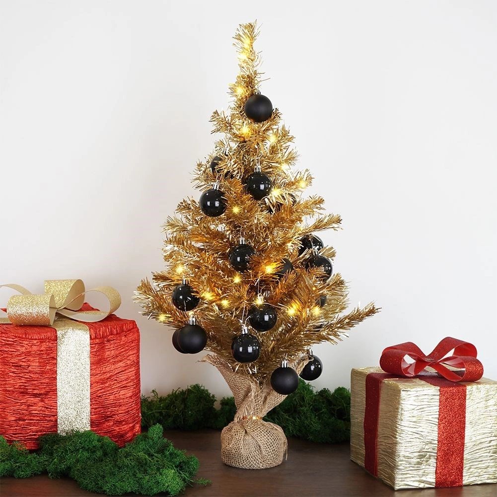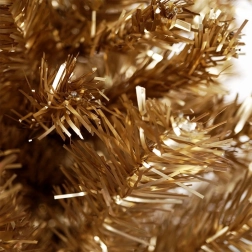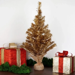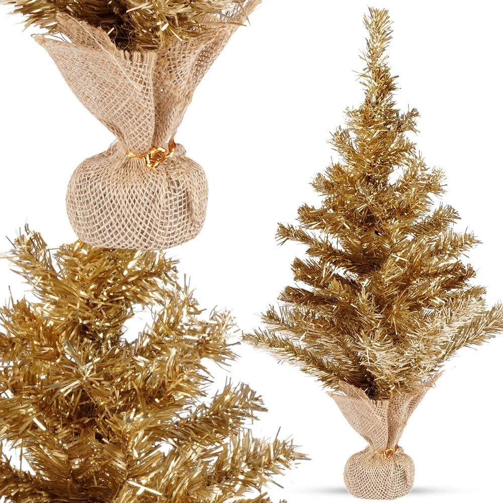 Tento kompaktný umelý vianočný stromček v luxusnej zlatej farbe sa skvele hodí do bytu, kancelárie aj menších priestorov. Vďaka pevného kovového jadra a stabilnej betónovej základni v jutovom obale bezpečne stojí a ľahko sa umiestňuje na stôl, policu alebo parapet.