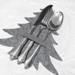 Doprajte sviatočnému stolovaniu jedinečný šmrnc. Elegantné sivé obaly na príbory z plsti v tvare vianočného stromčeka zvýraznia prestieranie a udržia príbory pokope. Vďaka premysleným prierozom je vkladanie a vyberanie príborov rýchle a pohodlné, pričom vrecko pojme tri veľké kusy – lyžicu, vidličku a nôž.
