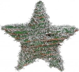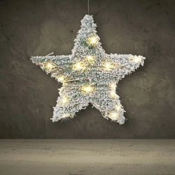 Táto dekoratívna vianočná hviezda spája prírodný prútený vzhľad s umelými vetvičkami ihličnanu so snehovým efektom. Integrované teplé biele LED rovnomerne presvetľujú tvar hviezdy a vytvárajú príjemné, útulné svetlo na zimné večery. Vďaka priemeru 30 cm vynikne v každom interiéri, či už ju zavesíte na dvere, do okna, alebo voľne opriete na policu.